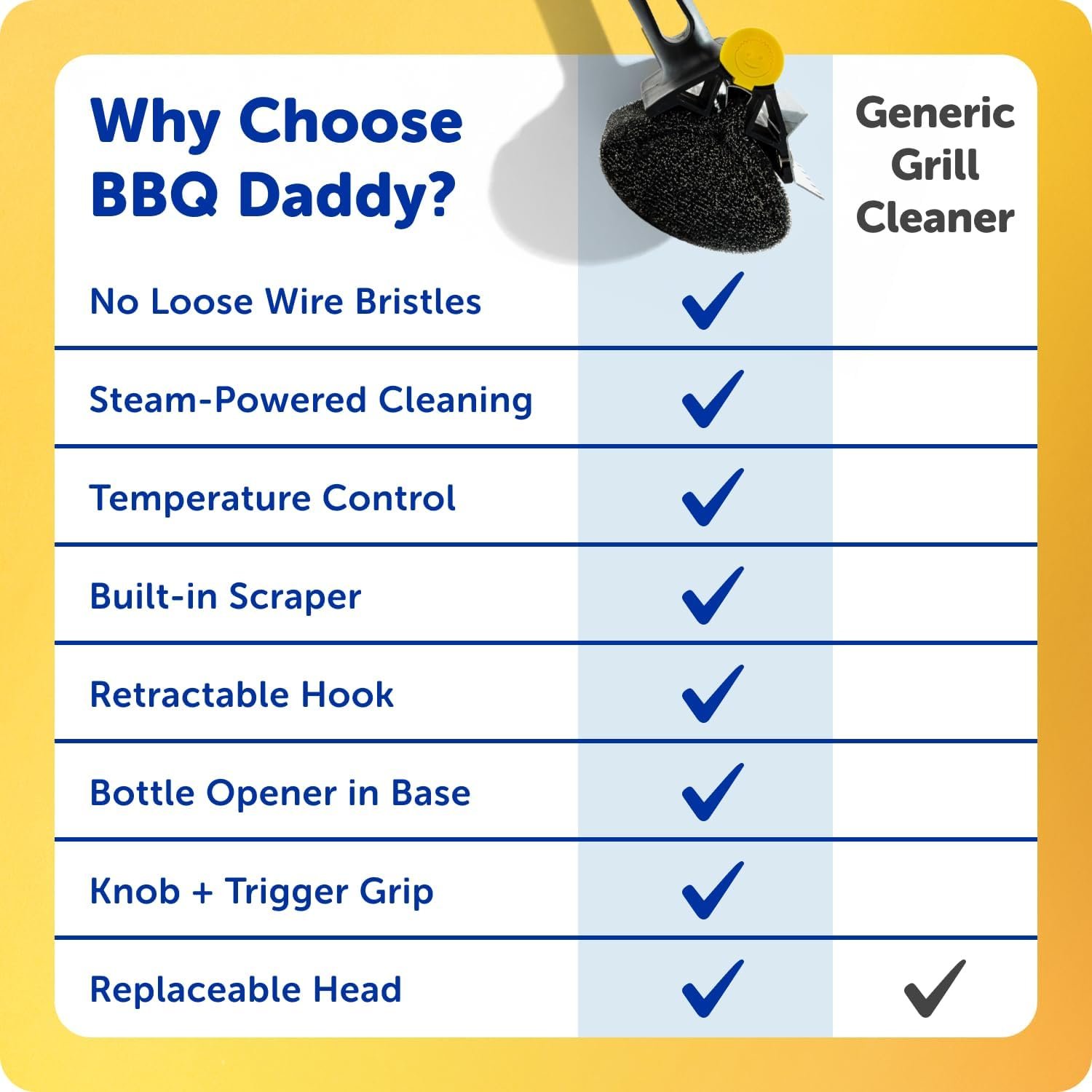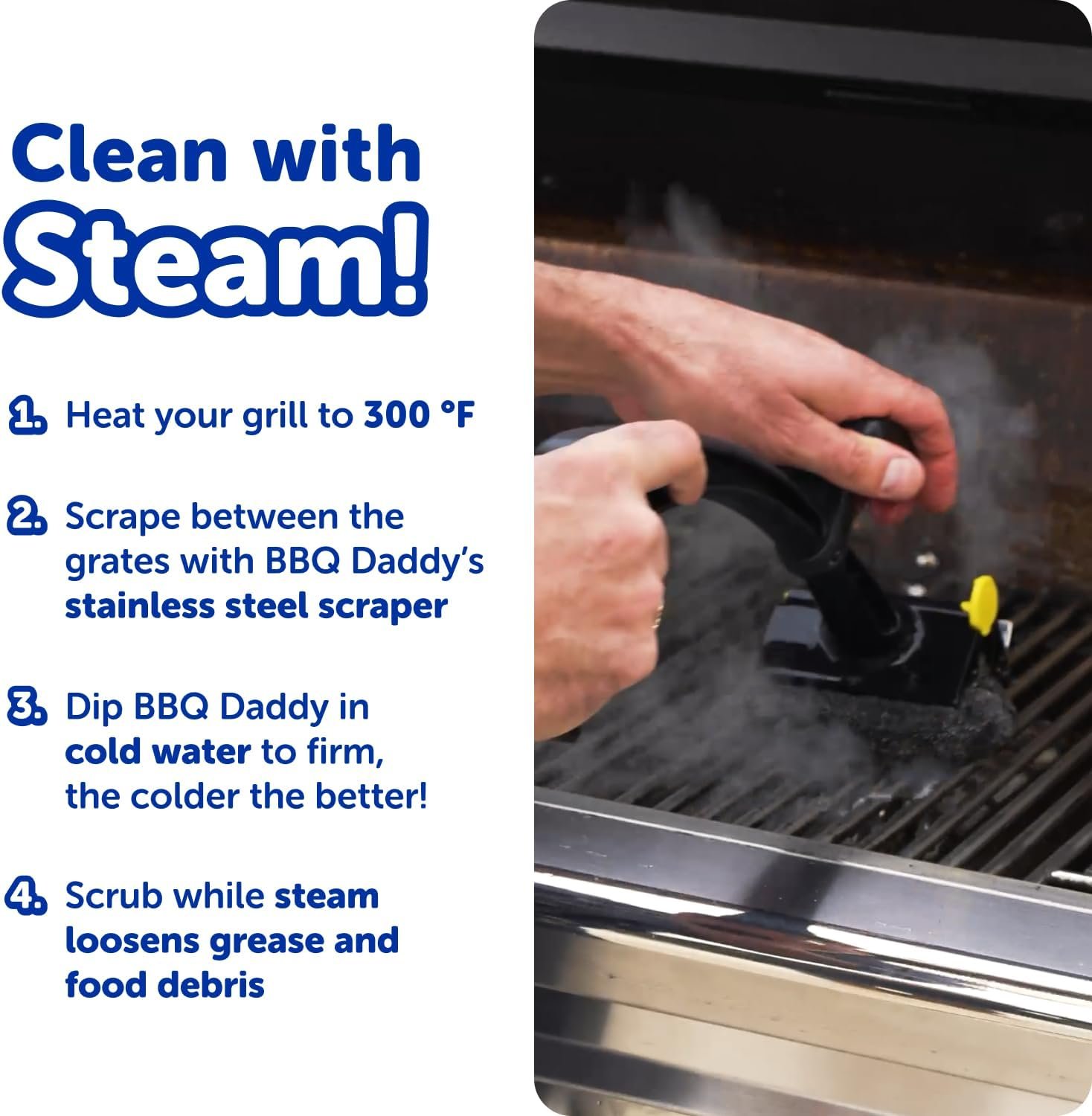 Harness the Power of Steam – BBQ Daddy is the ultimate grill brush for outdoor grill cleanup and can help you quickly scrub down a hot grill. As you scrub, steam from the grill helps the head soften to reach into grates for deeper grill cleaning.