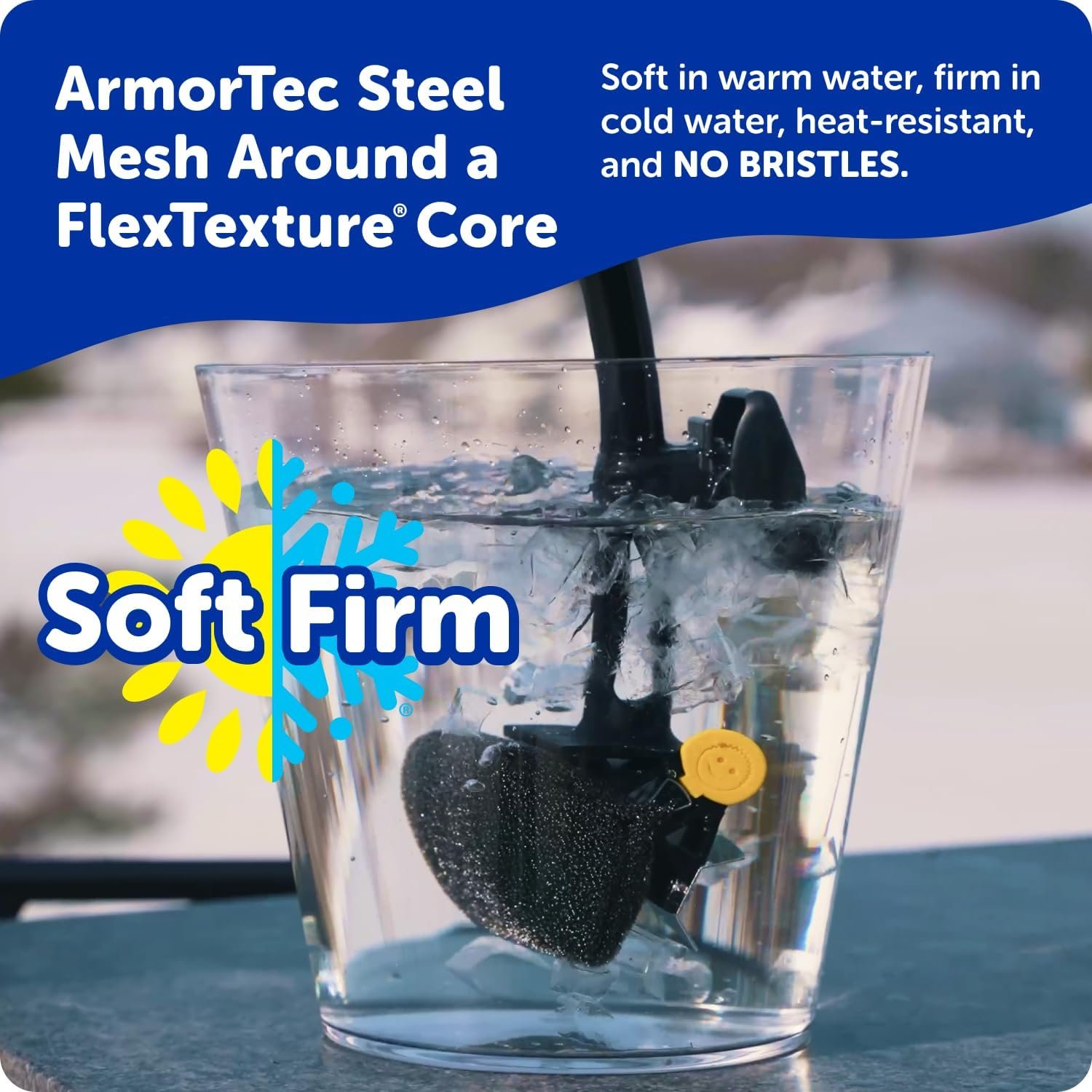 Clean with Steam, Not Bristles – Scrub Daddy Bristle Free Grill Brush for outdoor grills, uses a FlexTexture core that firms in cold water, and steam from the grill help the head soften to reach into grates for efficient grill cleaning.