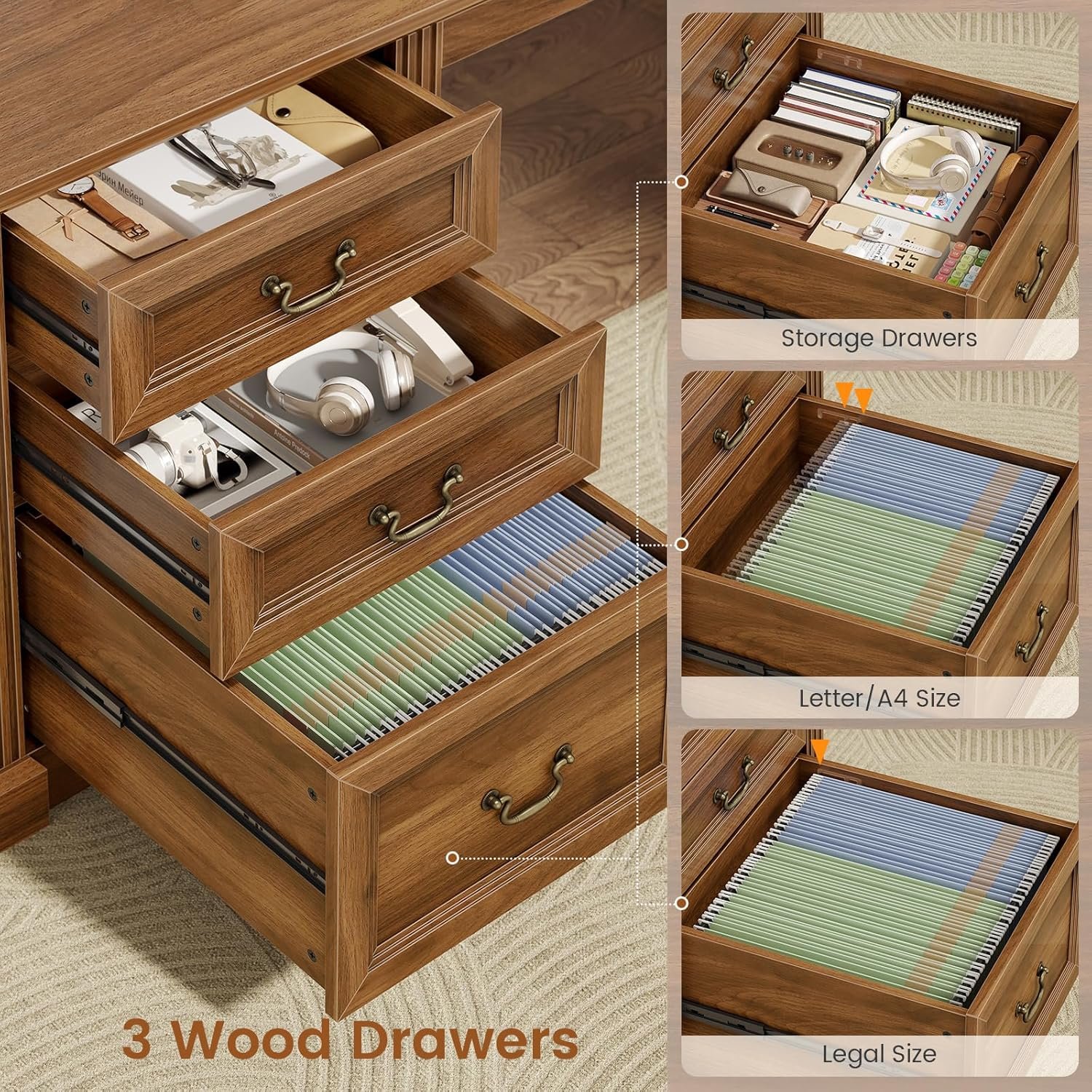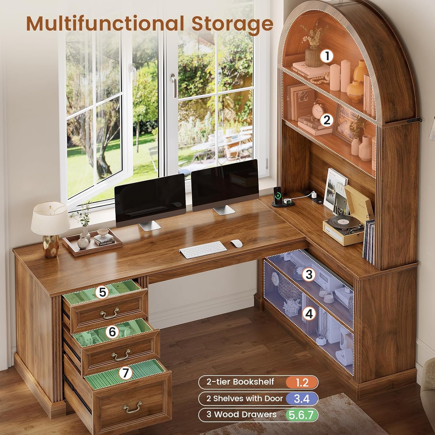 【Versatile Storage Solution】: L shaped desk with 3 wood drawers, 5-tier arched bookshelf, and a practical cabinet with sliding barn door, which can accommodate a large number of files, books, and other office essentials, file drawer can hold legal/letter/A4 files. Each drawer is equipped with a high-quality sliding rail that can withstand tens of thousands of uses, the smooth slide allows for effortless opening and closing.