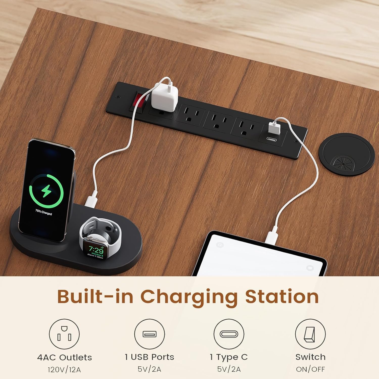 【Built-In Charging Station】Reduce desktop clutter and insufficient charging ports with the integrated charging design of this home office desk. It is equipped with a built-in charging station, including 4 AC outlets (120V/12A), 2 USB charging ports (5V/2A), a master on/off power switch, and a 5ft extended power cord. You can charge your smartphone, tablet, laptop, wireless headset and other electronic devices directly at the desk, helping keep your desktop tidy and your devices consistently powered during use.