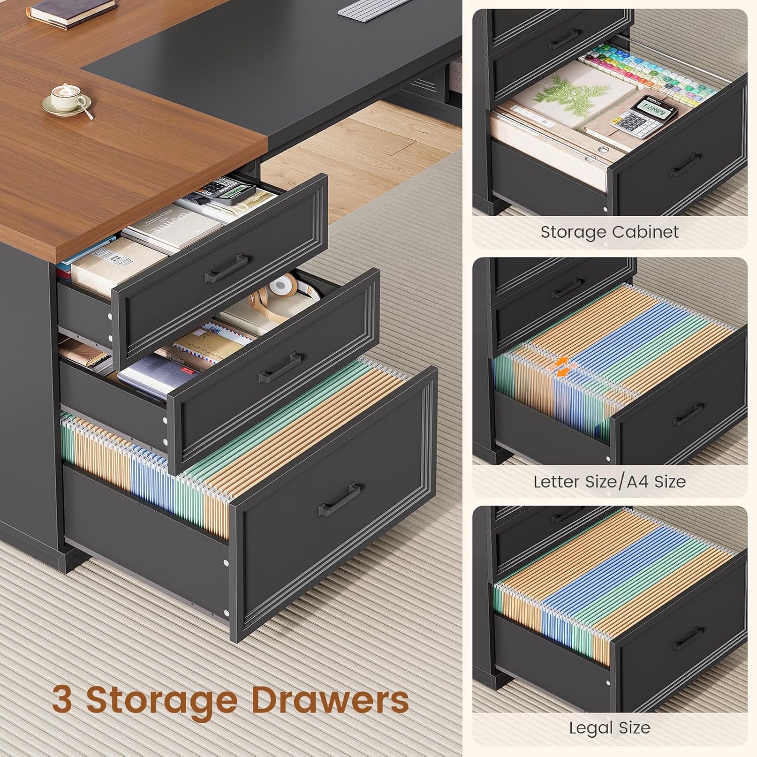 SEDETA 78.7″ L Shaped Executive Desk with Charging Station, Large Home Office Computer Desk with File Drawers & Adjustable Storage Cabinet, CPU Stand, Modern L Desk for Business, Black + Brown