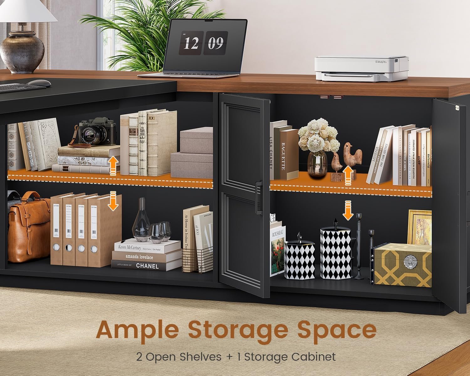 【Ample Adjustable Storage System】This executive desk is designed with a multi-functional storage layout to help you maintain a tidy workspace. It features 3 smooth-glide drawers on the left: 2 spacious utility drawers for stationery, notebooks and small office items, plus 1 full-extension file drawer that fits Letter, A4 and Legal size hanging file folders for organized document storage. On the right side, it includes a closed door cabinet and 2 open storage compartments, all fitted with height-adjustable shelves to customize space for books, binders, office equipment and items of different sizes.
