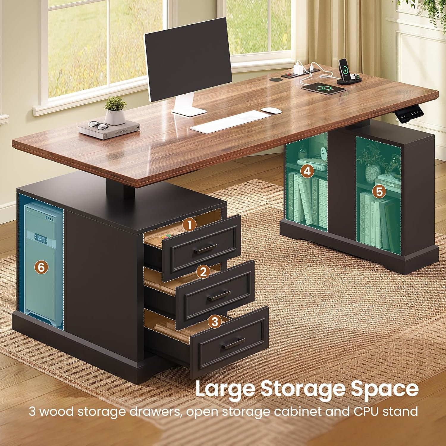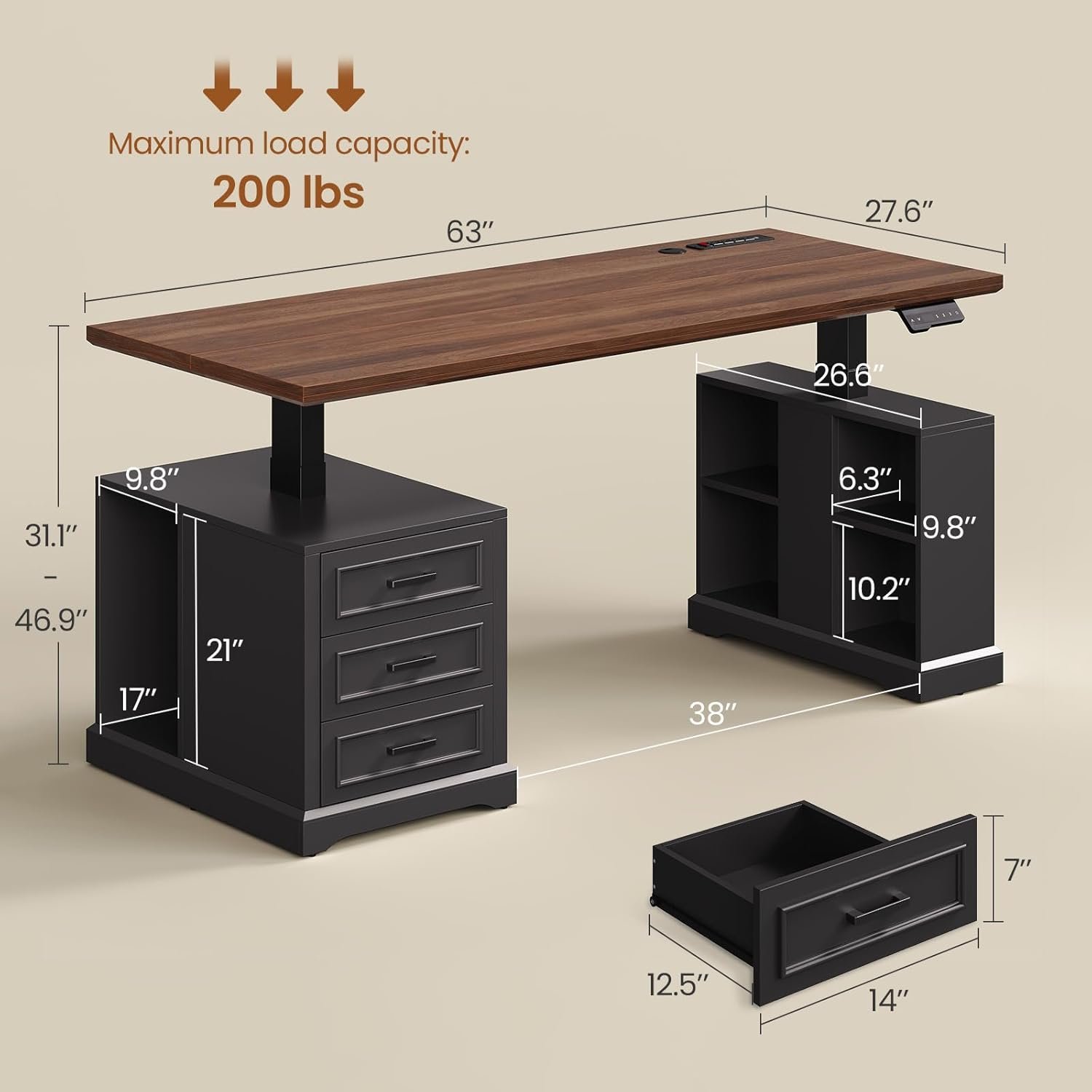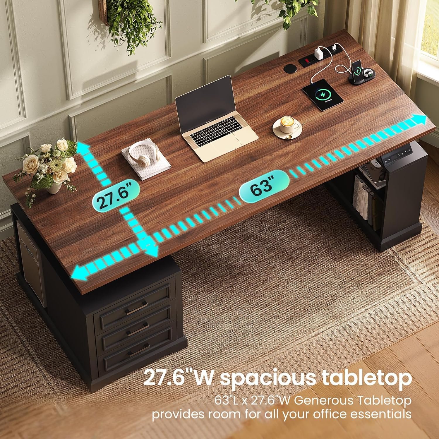 【Multifunctional Workstation】Create a multifunctional workstation with this standing desk, equipped with 3 storage drawer, power outlets, storage cabinet, CPU stand and a lifting motor to meet all your needs. 63”L * 27.6”W desktop breaking the rules of the game. This desktop is not only spacious but also provides you with more workspace, allowing efficiency and comfort to coexist.