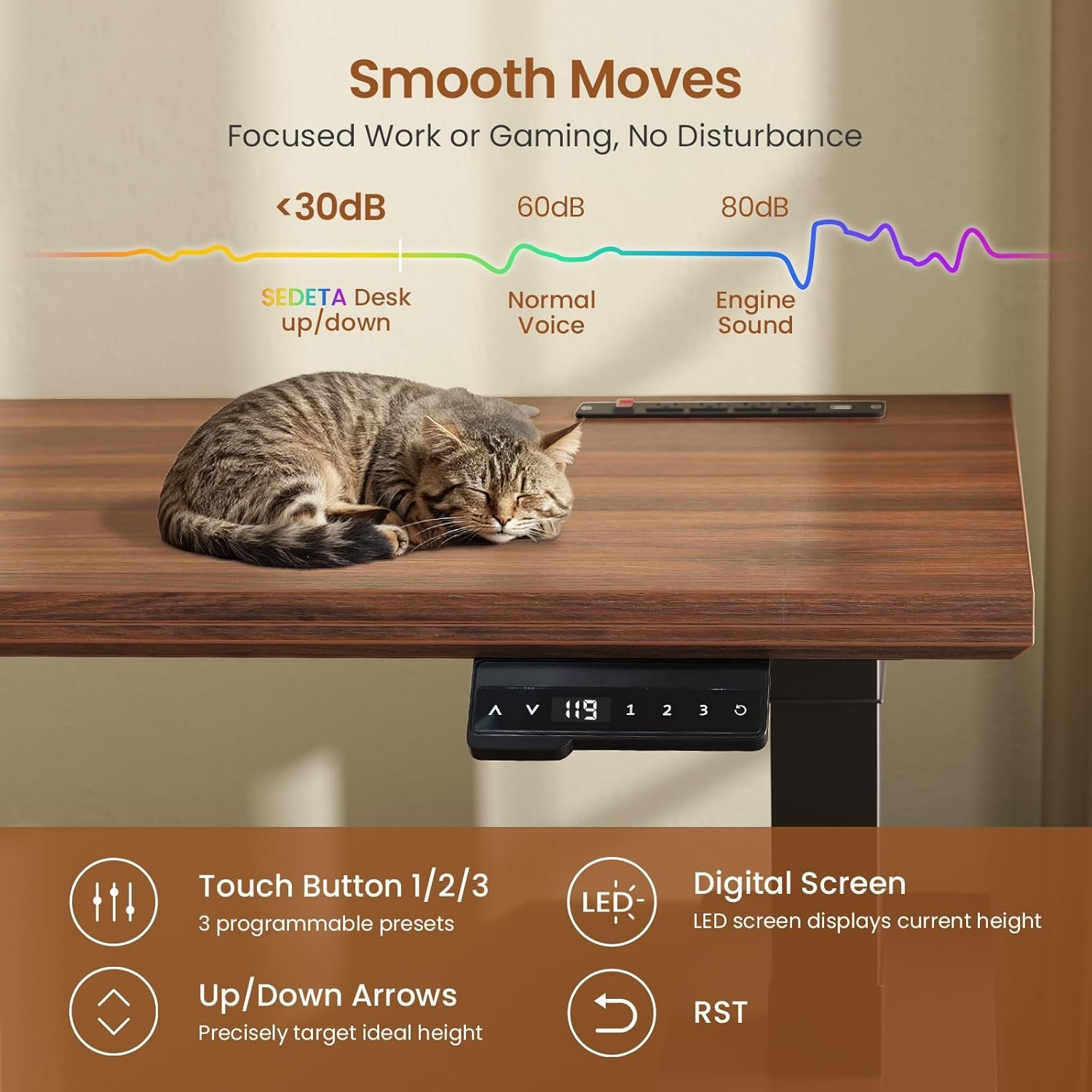 【Built to Last with Exceptional Stability】The industrial-grade steel frame and T-shaped design of the stand up desk support up to 200 lbs. Desktop made of P2 particle board, sturdy durable and anti-scratched. And powered by a robust yet quiet motor (operating at less than 30 DB). If your item arrives damaged, scratched or missing part, please feel free to contact us, we will send you free replacement or offer a partial refund.