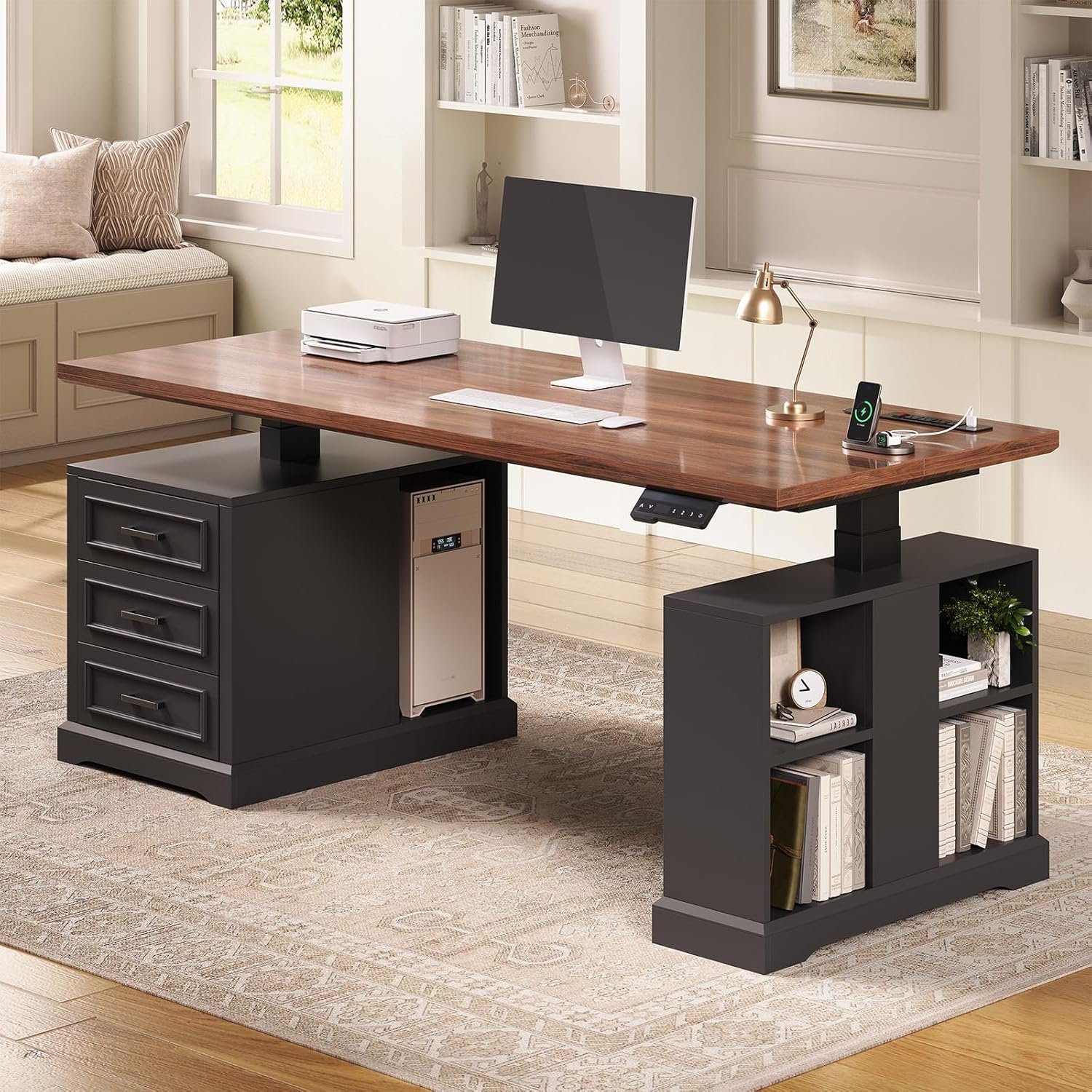 SEDETA Farmhouse Electric Standing Desk, 63″ Height Adjustable Computer Desk with 3 Drawers, Storage Shelves, Power Outlets, Wood Home Office Stand up Desk for Work, Study, Writing, Black