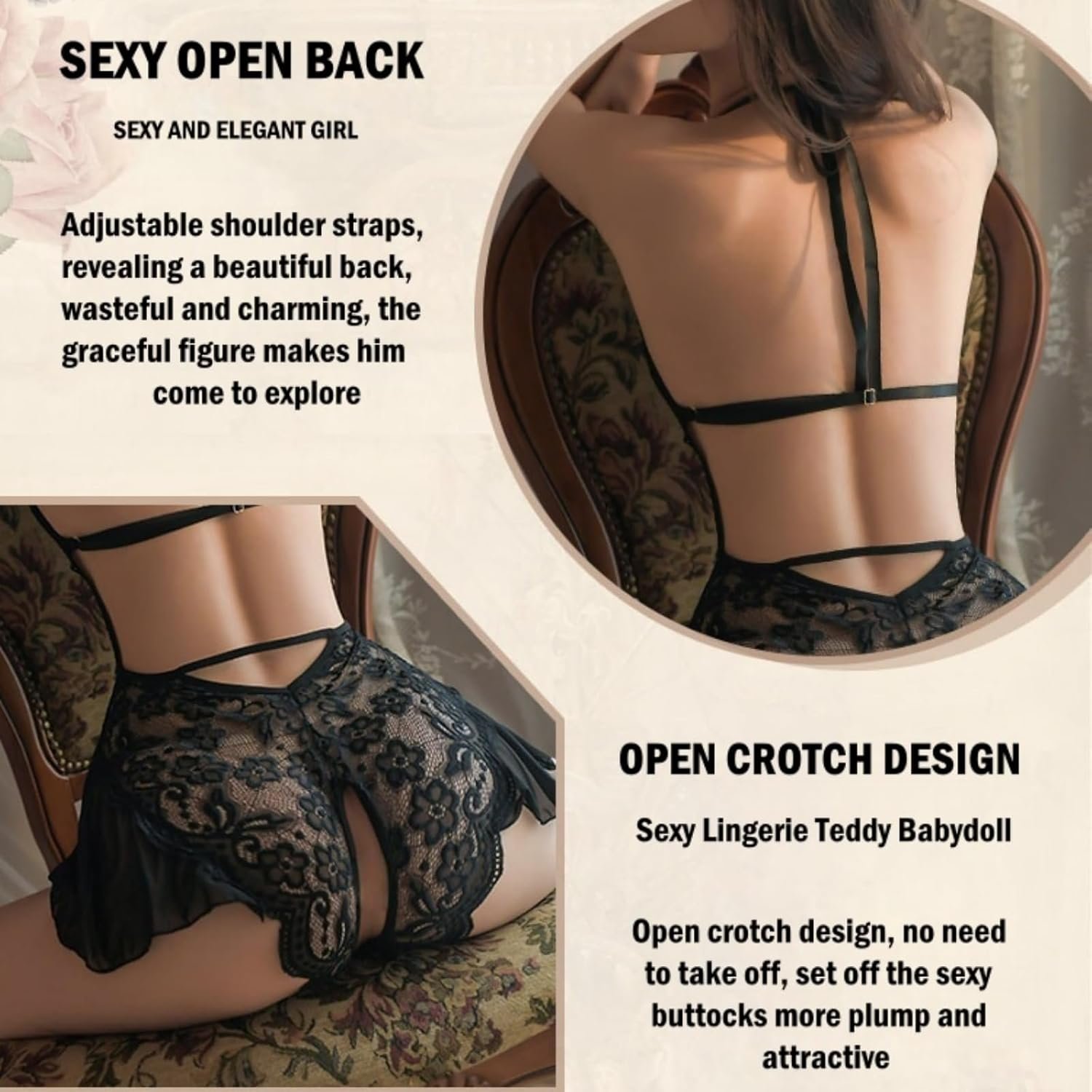 DESIGN: Sexy one piece lingerie features gorgeous floral lace fabric, visible soft wireless lace cups, sexy cut-outs, scalloped floral lace bodice, and a V-cut, leg-enhancing design. With stretchy mesh fabric and adjustable straps, it is easily adjustable to any size chest,it offers a perfect fit and easy wear. Unique design make you look charming and elegant