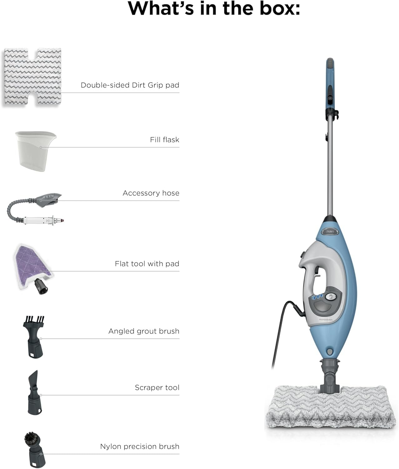 WHAT’S INCLUDED: 1x Steam Mop with a Detachable Handheld Steamer, 1x Double-Sided Dirt Grip Pad, 1x Fill Flask, 1x Accessory Hose, 1x Flat Pad Tool, 1x Scraper Tool, 1x Nylon Precision Brush, and 1x Grout Brush Tool.