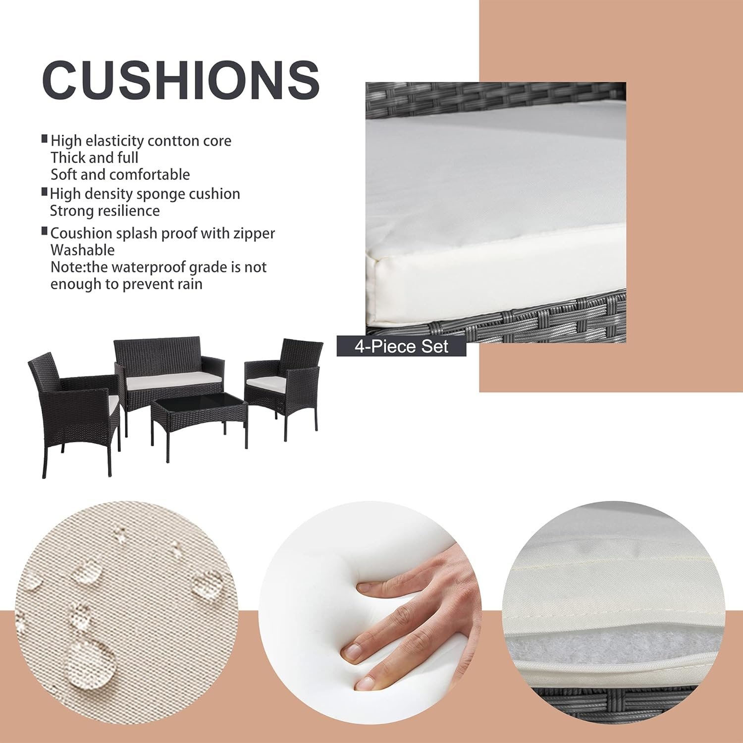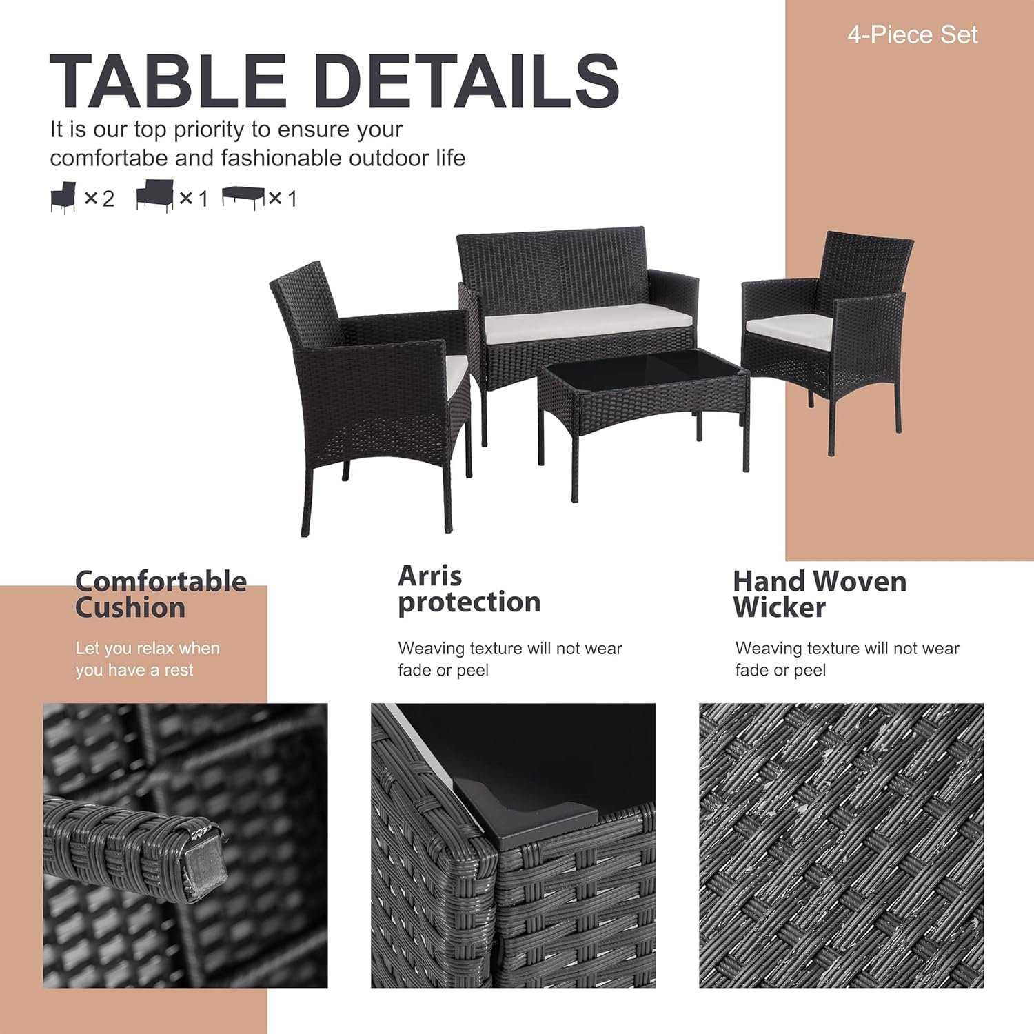 Sturdy and Durable: This patio furniture set is made of a powder-coated steel frame ensuring overall stability. all-weather PE Rattan wicker is waterproof and UV-resistant, which can prevent damping and fading.