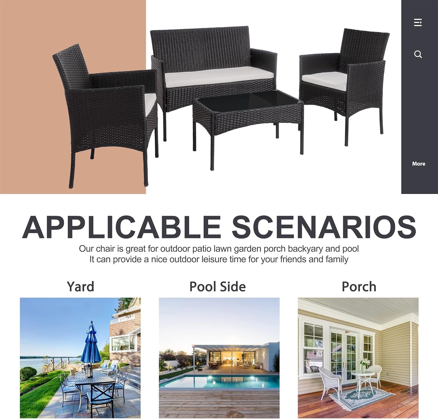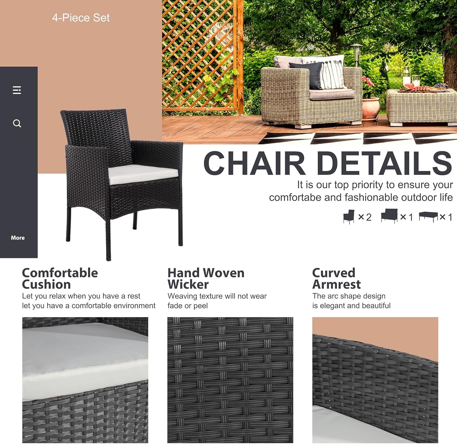 Updated Comfort:This modern outdoor patio furniture set comes with thick spongy cushions, Deep patio chairs will offer you extraordinary comfort experience. Roomy seating space allowing your back to naturally lean and stretch to relieve your fatigue and fully enjoy leisure time.
