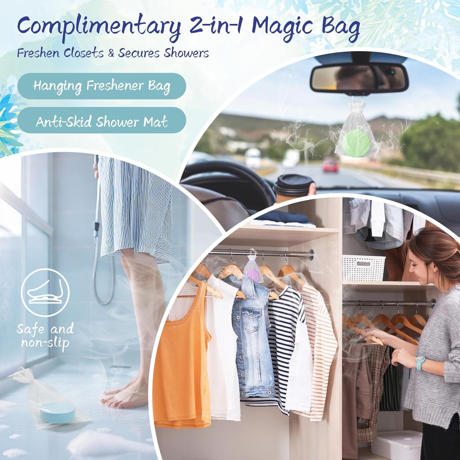 Enduring and Soothing Aroma: Our Shower Steamers are made with natural ingredients and plant essential oils,crafted without any chemical additives, ensuring they are non-irritating and hypoallergenic, making them suitable for all skin types. Through continuous upgrades and improvements, we have enhanced our shower steamers to emit a fresher, richer, and longer-lasting fragrance than others. Enjoy a shower that helps you relieve the stress and fatigue of the day