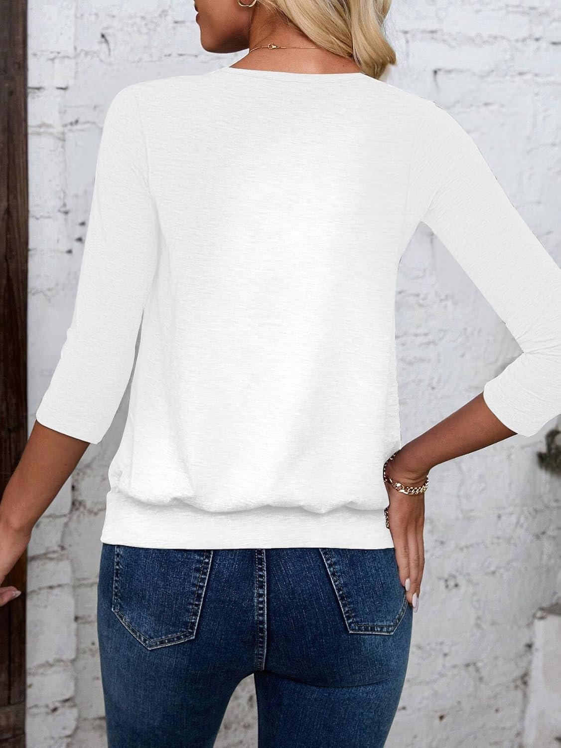 The video showcases the product in use.The video guides you through product setup.The video compares multiple products.The video shows the product being unpacked. 3/4 Length Sleeve Womens Tops Merchant Video
