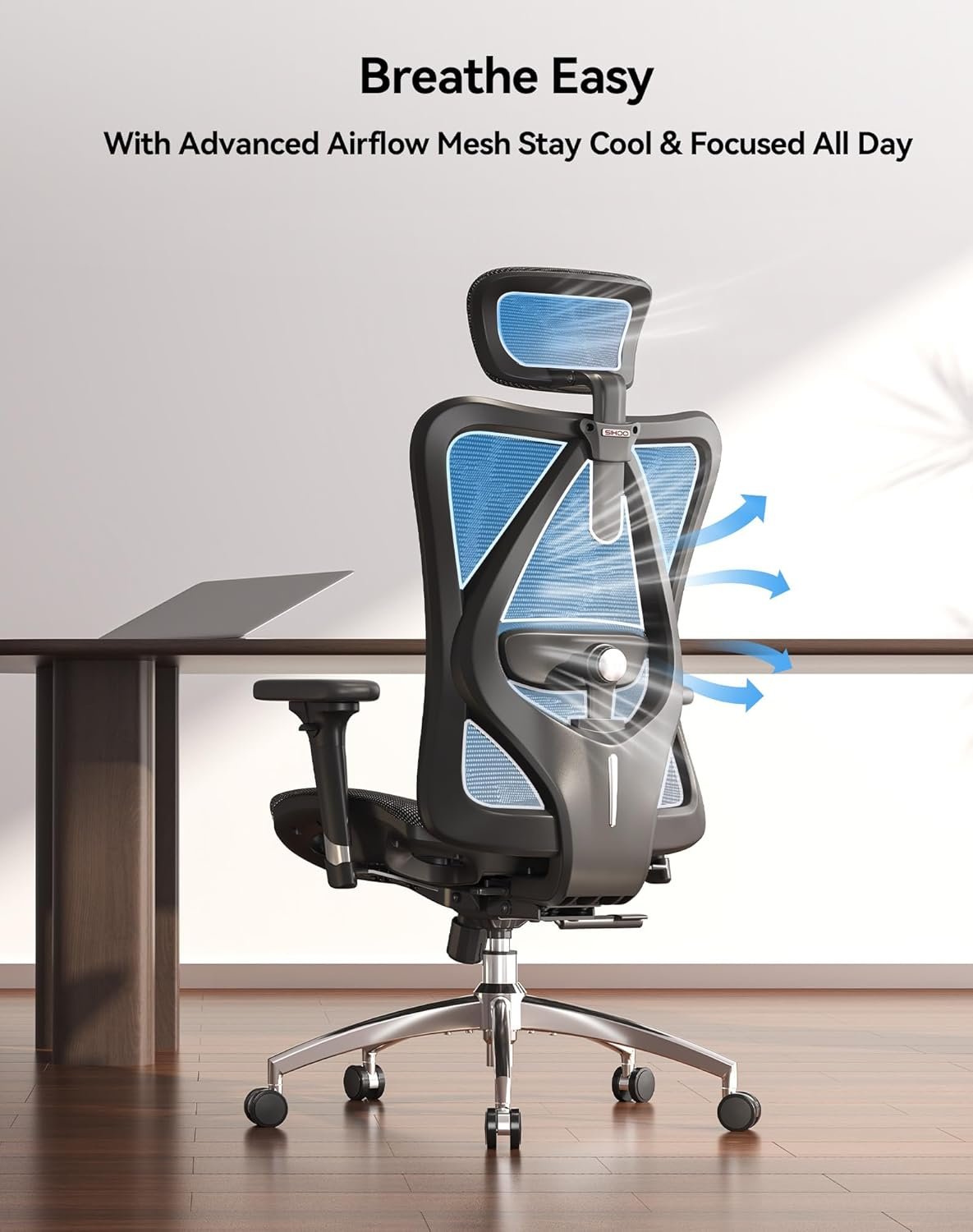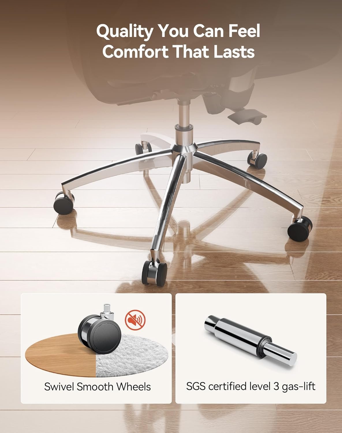 STABLE, DURABLE, AND QUIET – Built with a reinforced aluminum base and a dual-frame backrest, our desk chair holds up to 330 lbs with ease, staying sturdy and supportive even with daily use. Smooth-rolling, silent casters glide across the floor without noise or scratches—perfect for quiet workspaces.