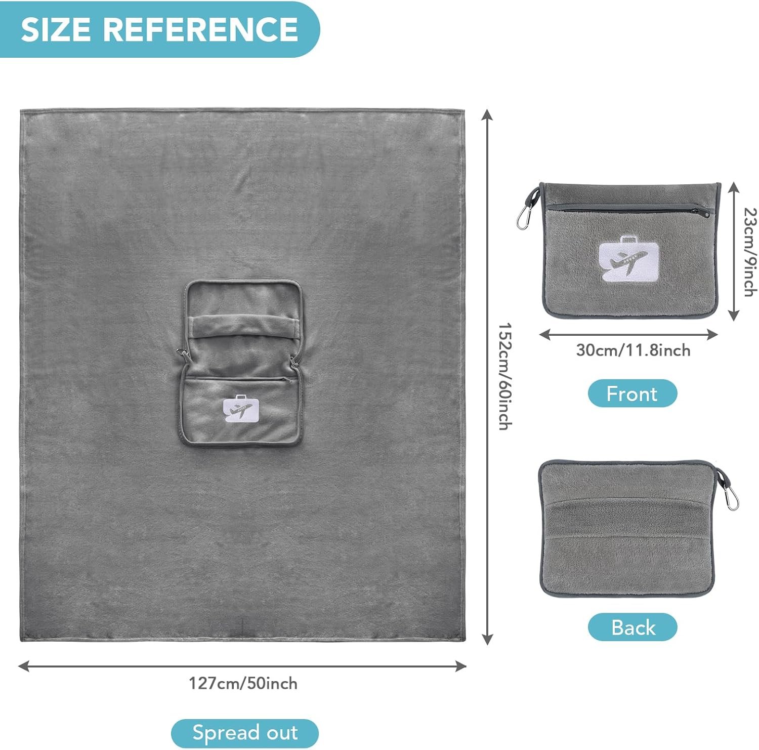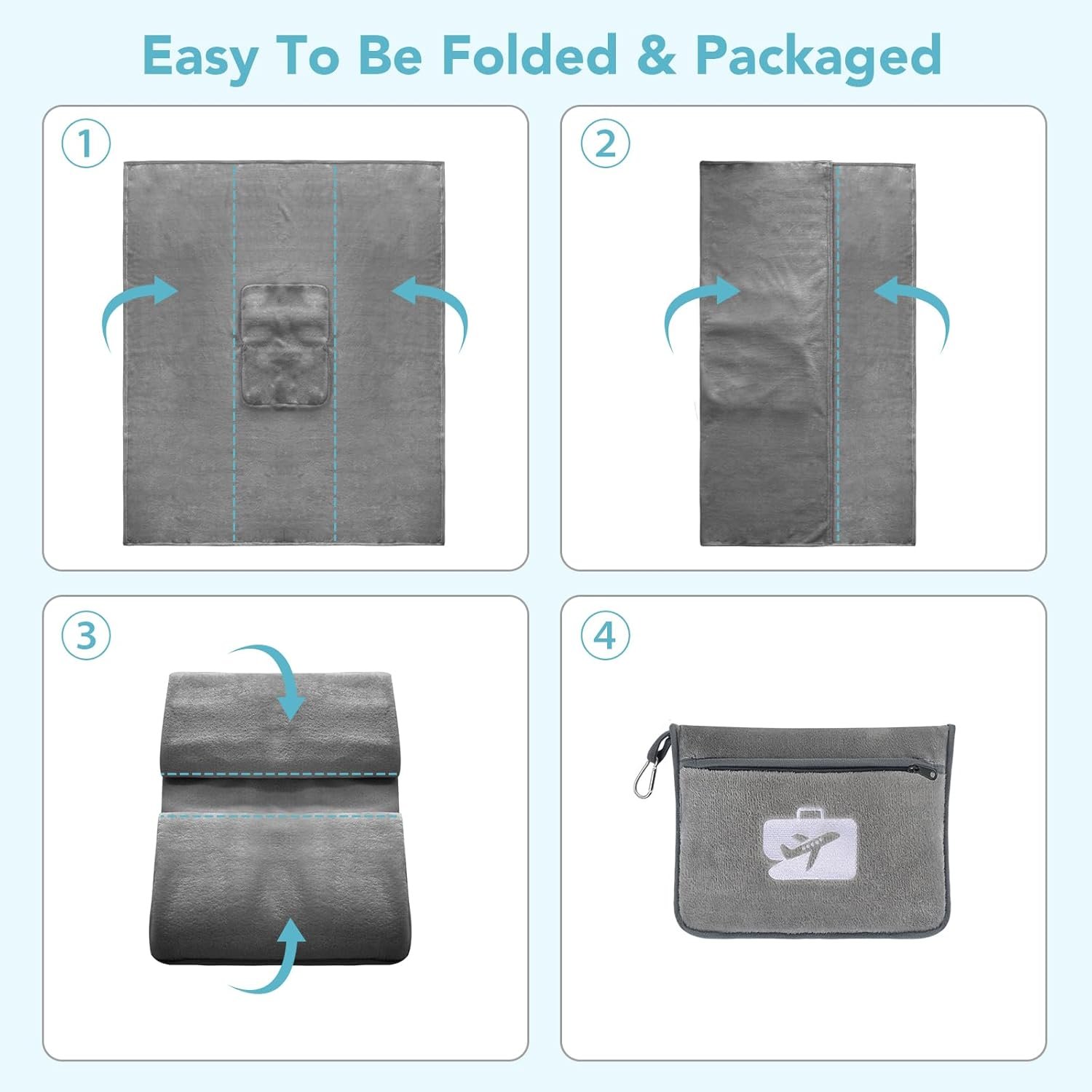 Travel Essentials: Our generously sized travel blanket compact unfolds to 60” x 50” (152 x 127 cm) and folds down to 12” x 10”(30 x 25 cm). This travel pillow blanket set offers ultimate convenience for frequent travelers and is an essential cabin item for adults and children