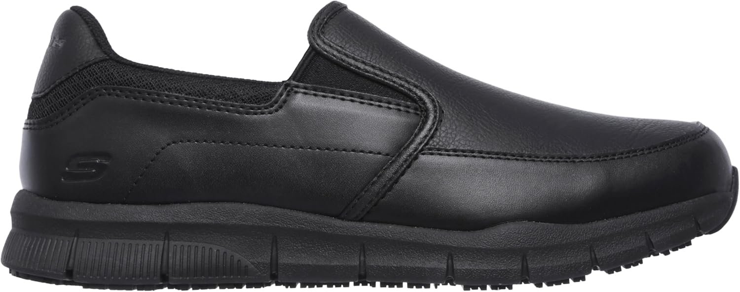 Elevate your workday comfort with these professional Work Relaxed Fit Nampa Groton SR work shoes for men. These non slip work shoes for men feature a smooth synthetic leather upper with convenient slip-on design, twin gore panels for easy wear, and Memory Foam cushioning. The slip-resistant outsole provides reliable traction on various surfaces, while the electrical hazard safe design offers additional workplace protection.