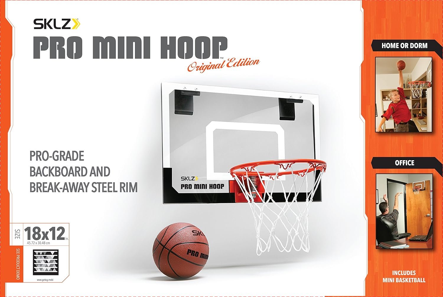 Practice your shooting skills with the SKLZ Pro Mini Basketball Hoop–the ultimate addition to your dorm room or office for endless basketball fun and skill improvement. This indoor mini basketball hoop brings authentic basketball action right to your space, with a pro-grade steel rim that mimics the look and feel of a full-sized rim, boosting your confidence and getting you ready for real games. Practice your bank shot and hone your shooting technique without worry. The 18″ x 12″ clear polycarbonate backboard is built to withstand your toughest practice sessions, ensuring it won’t break during intense play, while the 9″ spring-action break-away rim bounces back after every rebound, making it perfect for working on your dunking skills and increasing your vertical leap. No need to worry about wear and tear on the net either, as the 30-ply basketball net is designed to endure your daily practice sessions or games without the need for frequent repair or replacement. Setting up the Pro Mini Basketball Hoop is a breeze–simply hang it over any door frame and move it around to suit your needs with the slide-on door mounts, which come with protective foam padding to prevent any damage or marks. No need to purchase a basketball. The SKLZ Pro Mini Basketball Hoop comes with an indoor-safe 5″ rubber basketball, so you can start playing and practicing right away. Take your love for basketball to new heights with this top-notch mini basketball hoop and experience the excitement of the game anytime, anywhere.