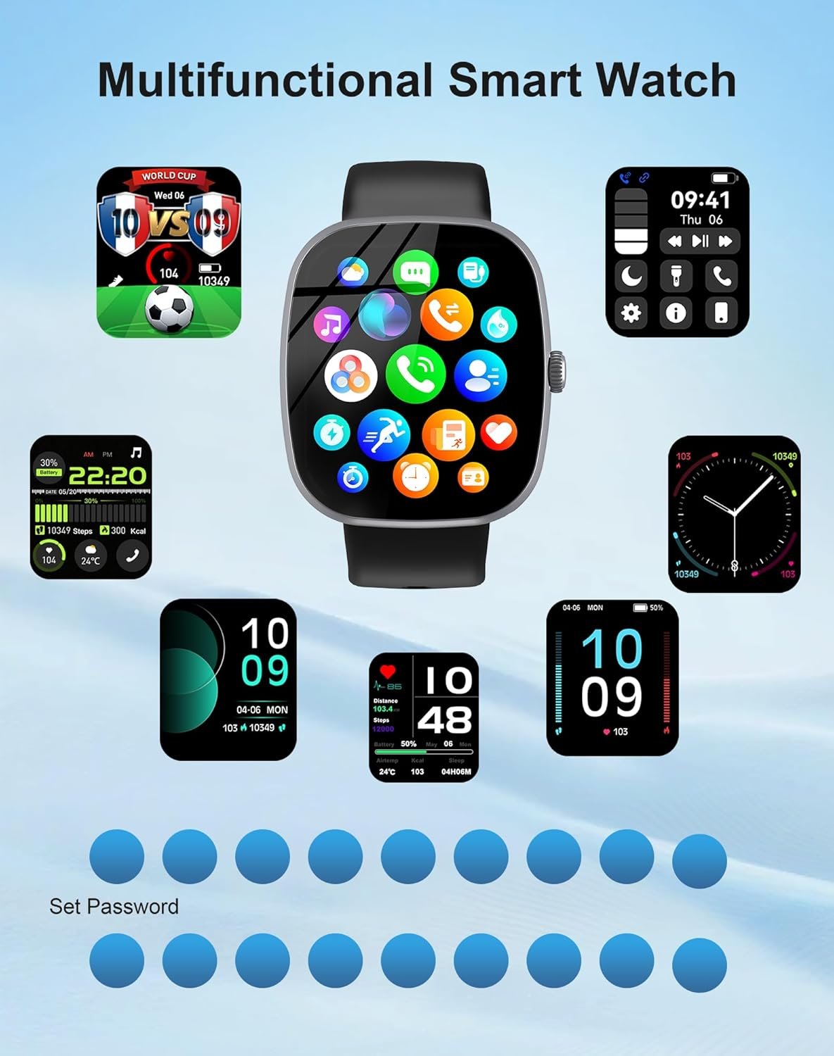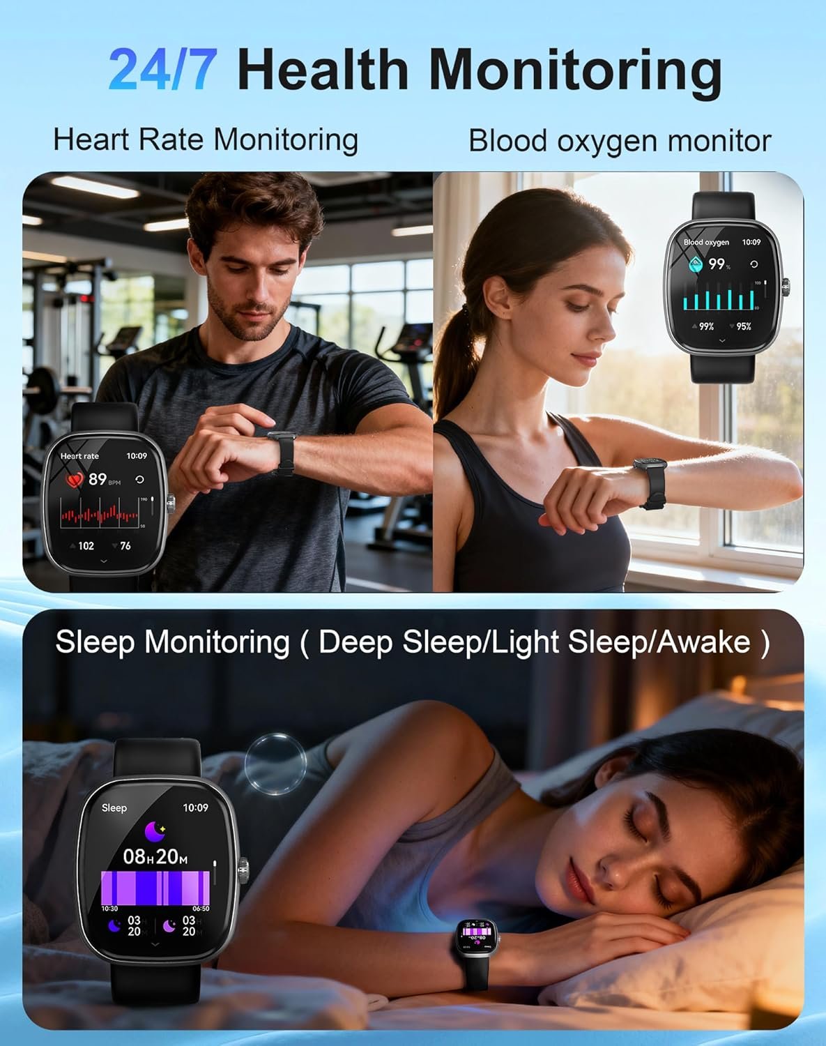 24/7 Real-Time Monitoring: This fitness watch is equipped with high-performance sensor chips and photoelectric sensors to monitor your health data with low power consumption continuously. It can track heart rate, blood oxygen, blood pressure and sleep status in real-time for 24 hours, automatically identify sleep stages and generate analysis reports to help optimize your work and rest schedule and improve sleep quality