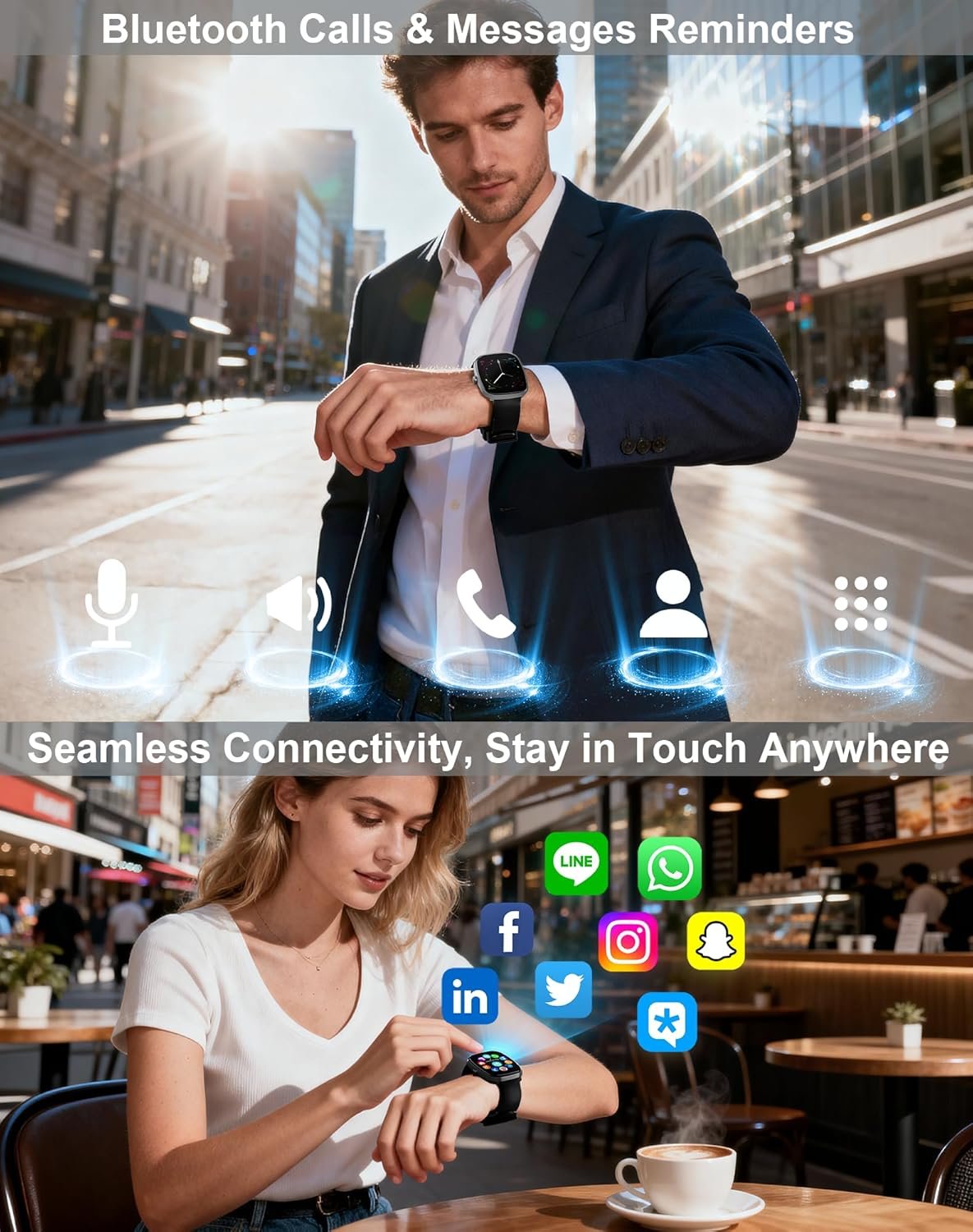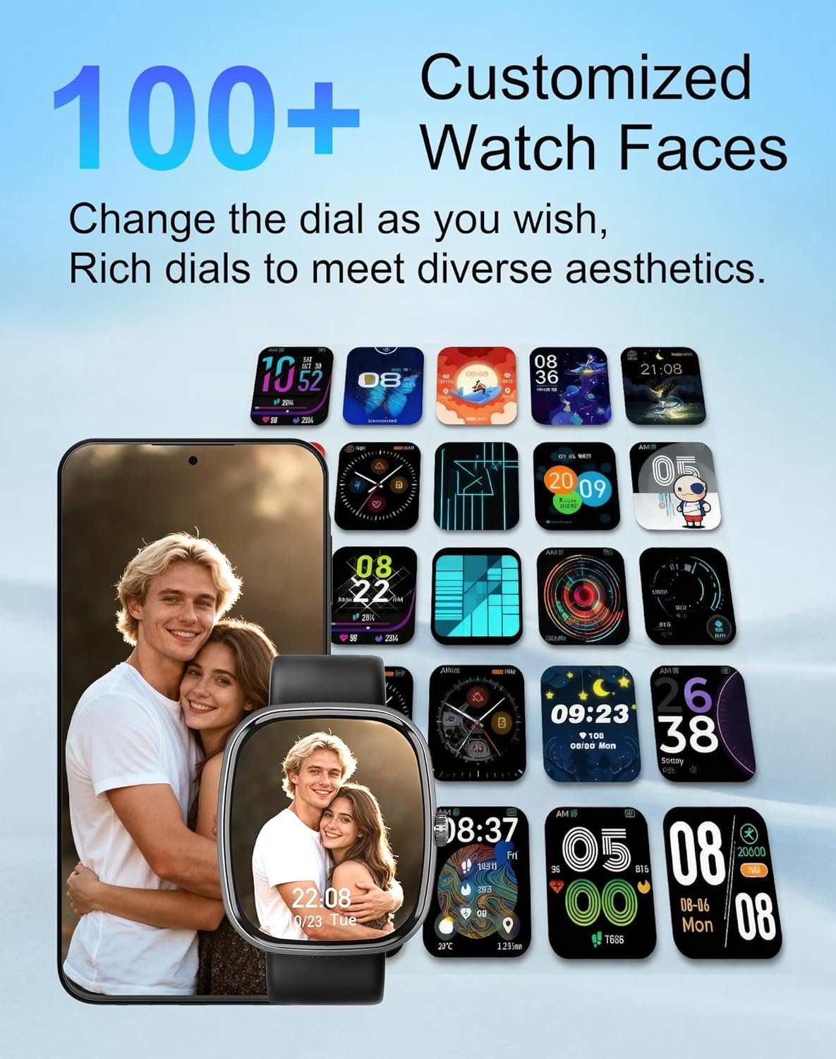 Bluetooth HD Calling & Smart Notifications: This smart watch adopts a Bluetooth 5.3 chip to connect to your phone quickly and stably. With a built-in high-definition microphone, you can make and receive clear calls directly from the watch, freeing your hands. Incoming calls, text messages and notifications from popular apps such as Facebook and WhatsApp will remind you to check through gentle vibrations, making you stay connected while working, exercising or traveling