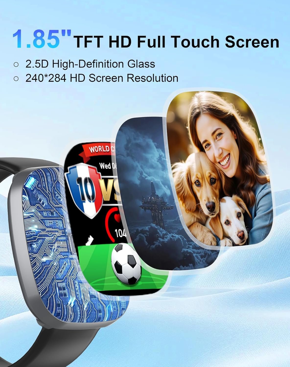 1.85“HD Display & Customizable Dials: This Android smart watch is equipped with a 1.85” TFT HD color screen with a resolution of 240*284, providing clear and sharp visual effects. Equipped with 2.5D high-definition glass, makes your smartwatch more scratch-resistant. More than 100 personalized dials are provided through the “Domoteer” application for you to choose from. Or set a personal photo as the background to create a unique style every time you wear it