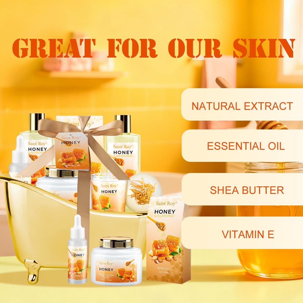 Spa Gift Basket for Women & Men, Honey & Almond bath and body Pamper Kit, Skin Care Kit, Home Spa Gift Set, Self-Care Kit, Body Essential Oil, Birthday, Christmas, Mother Day, Anniversary