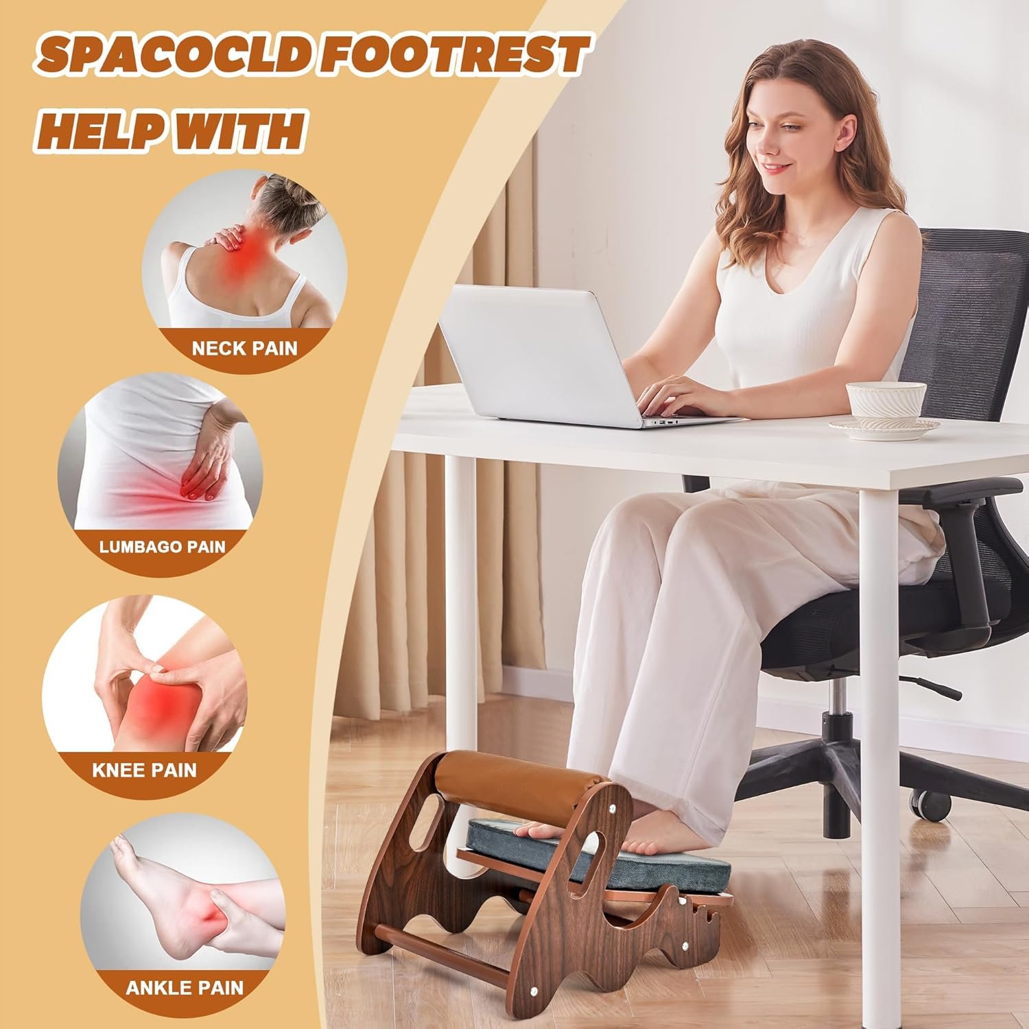 【QUALITY ASSURANCE】: Spacocld’s under-desk foot rest is crafted from high-quality solid wood, offering superior stability and toughness. Unlike plastic footrests, it has a longer lifespan and features anti-slip glue on the bottom to prevent slipping
