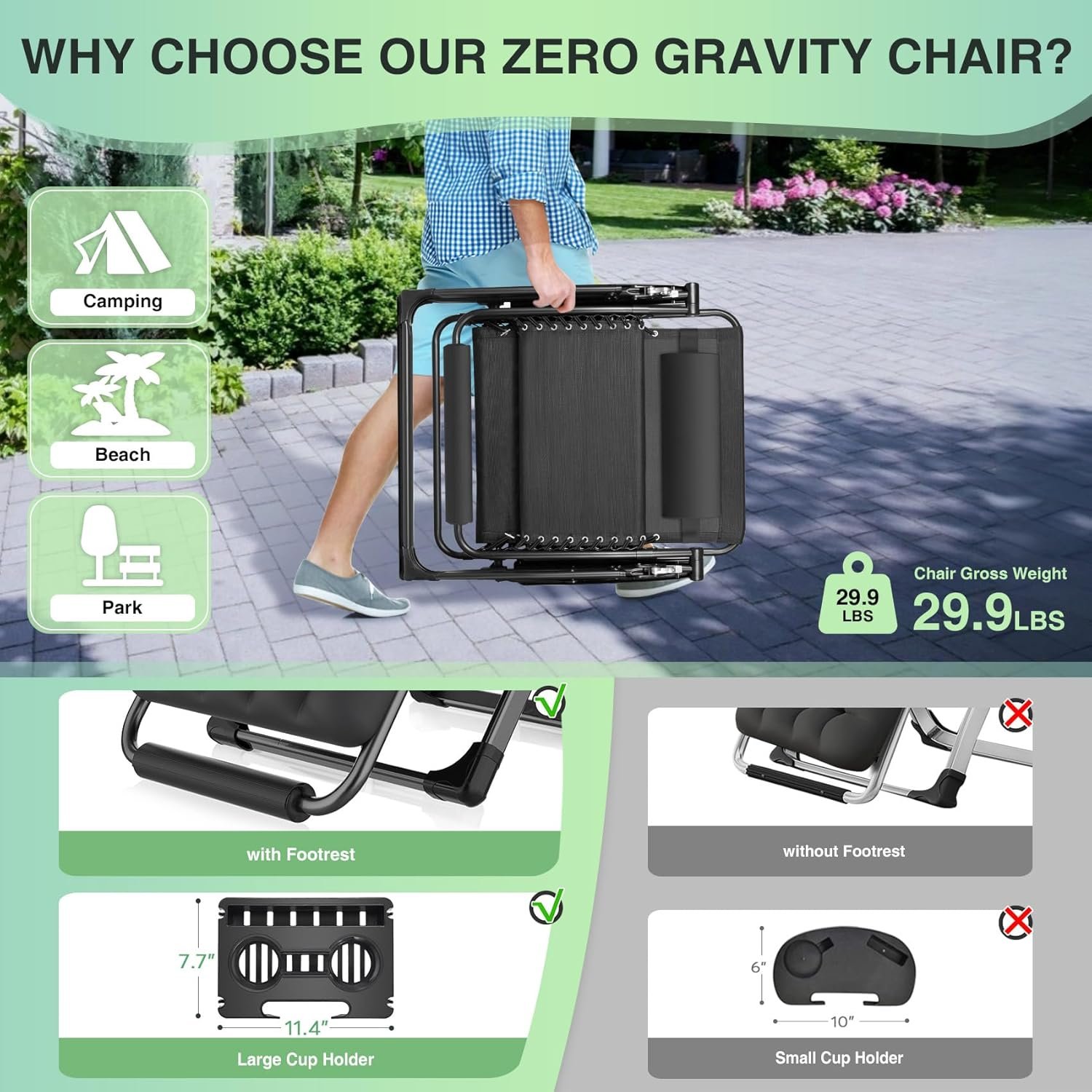 【Portable and Versatile】This foldable zero gravity chairs arrive fully assembled—simply unfold it and it’s ready to use within seconds. Its lightweight, foldable design makes it easy to carry and store, perfect for use in your yard, lawn, patio, deck, garden, balcony, poolside, or at the beach