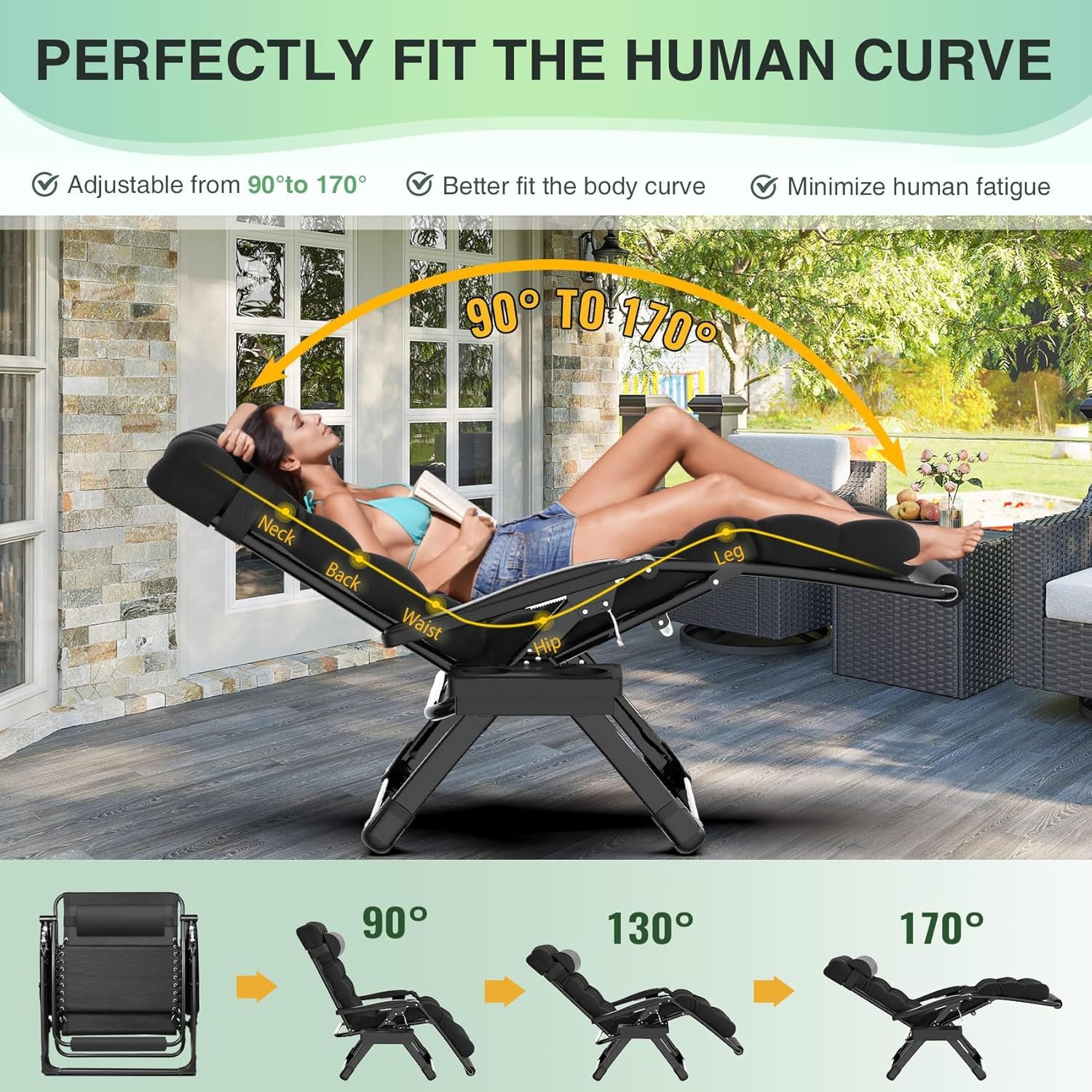 【Effortless Adjustment & Secure Locking】The zero gravity recliner features a 4th-generation upgraded aluminum alloy locking system, allowing smooth adjustment from 90º to 170º with minimal effort. Its 8mm deep locking groove provides a stronger, more reliable hold—far superior to previous 2mm plastic or aluminum buckles—ensuring enhanced safety and preventing accidental slipping. Enjoy seamless reclining and a true weightless, stress-free relaxation experience