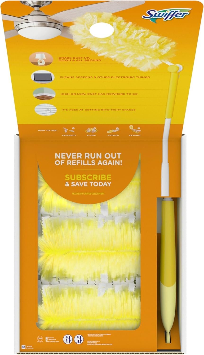 Swiffer Duster Kit with 3 ft Extendable Handle, Heavy Duty Dusting Starter Kit with 12 Refills, for Ceiling Fans, Vents and Hard to Reach Places