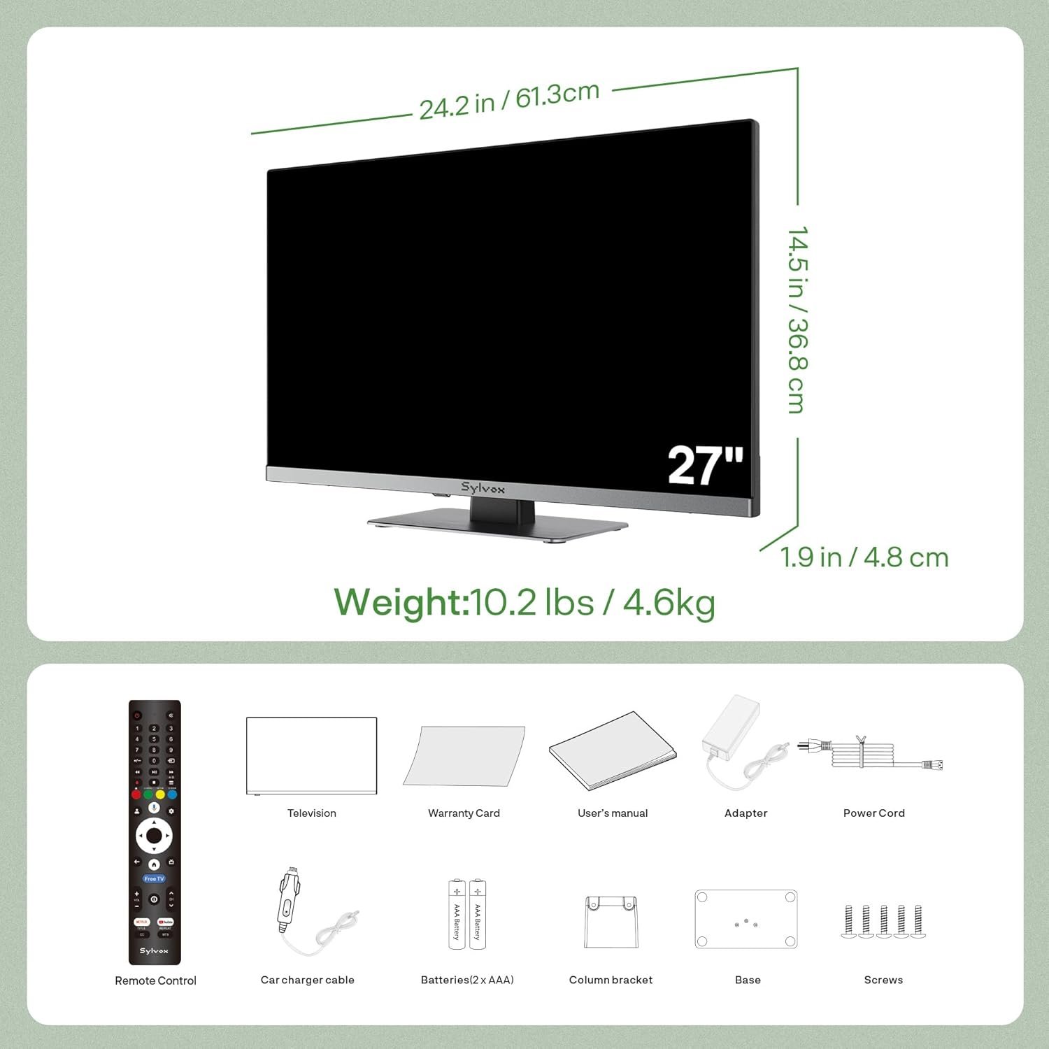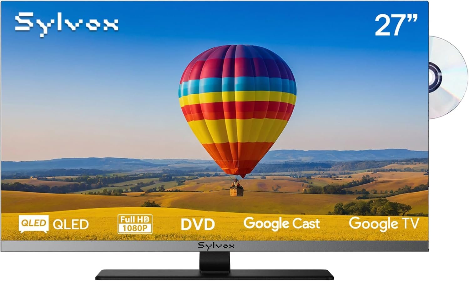 SYLVOX 27″ 12V/24V Smart RV TV with Google TV & Built-in DVD Player, Frameless 1080P Full HD QLED Display, Shock-Resistant, Wide Voltage Support (9–32V), Voice Control Remote (Limo QLED Series 2026)