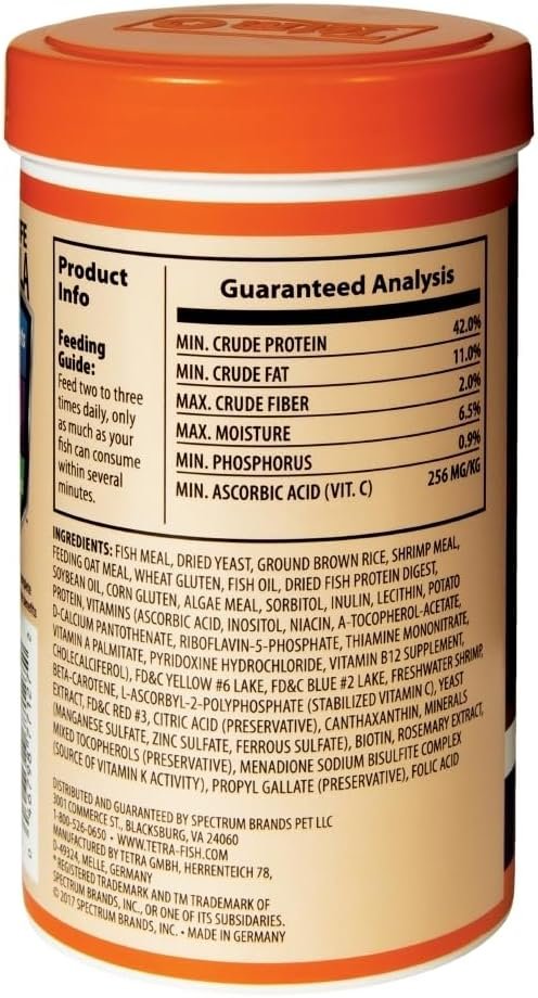 Tetra Goldfish Flakes are a nutritionally complete daily diet for all goldfish and small koi Ideal for use in aquariums and outdoors in small ponds too This scientifically developed mix of highly nutritious ingredients plus vitamins minerals and trace elements will enhance your fish’s naturally brilliant colors Includes patented health-enhancing Pro-Care formula to help support your fish’s immune system for optimal health and long life This precise blend of immuno-stimulants vitamins biotin and omega-3 fatty acids is custom designed to strengthen a fish’s resistance to disease and stress Feed your goldfish two to three times daily only as much as your fish can consume within several minutes Tetra brand’s flake food formulations have been designed to be easily digested by fish and not to leach color helping to keep aquarium water clean and clear when used as directed Since 1951 Tetra has developed the world’s most comprehensive body of fish food knowledge and fish-keeping enthusiasts have looked to the brand for products and solutions that add ease and beauty to their home Whether you’re an experienced hobbyist or just starting out Tetra has everything you need – from a large variety of quality fish food and innovative equipment to test kits and decor.