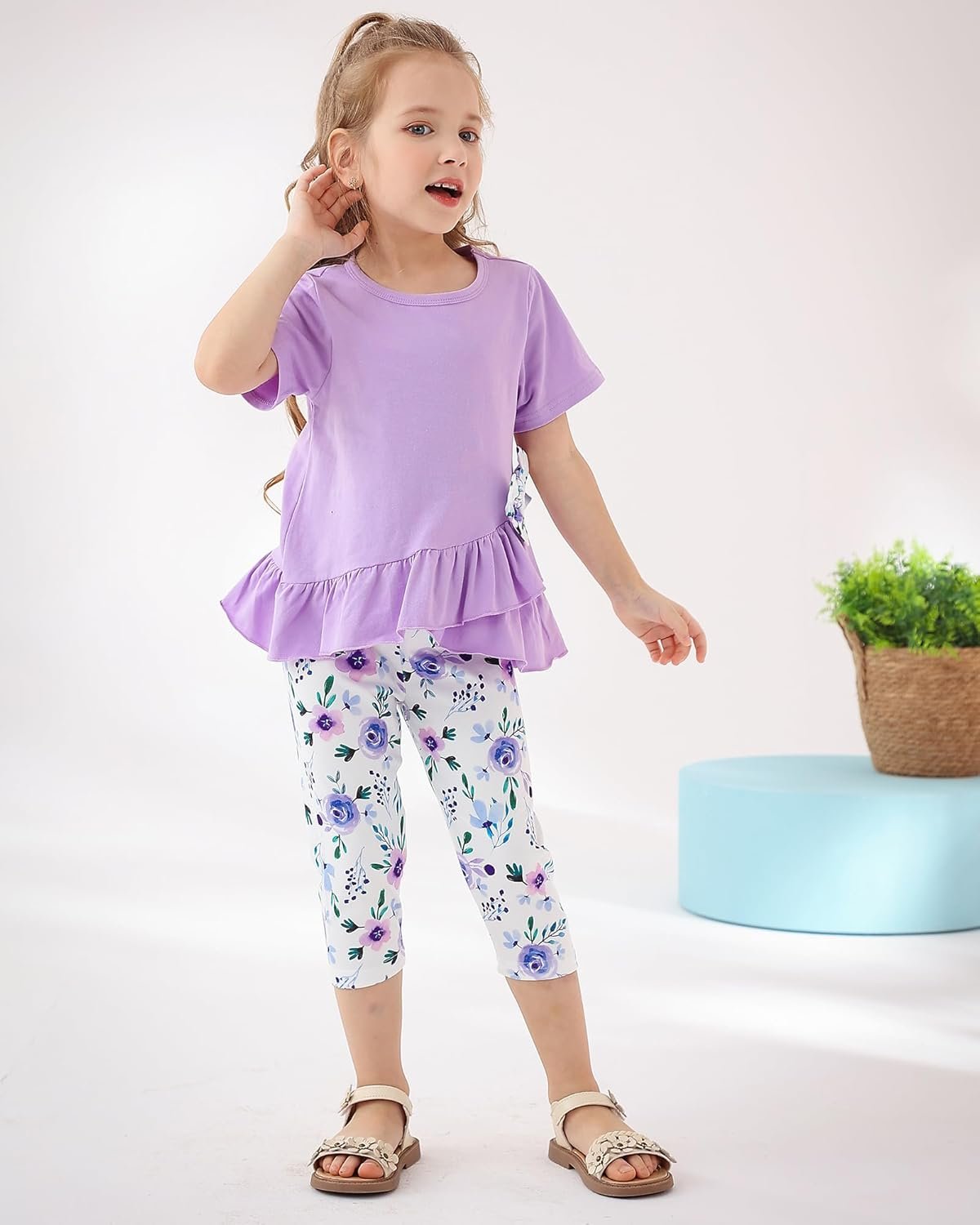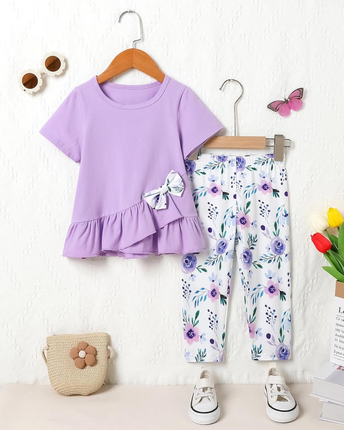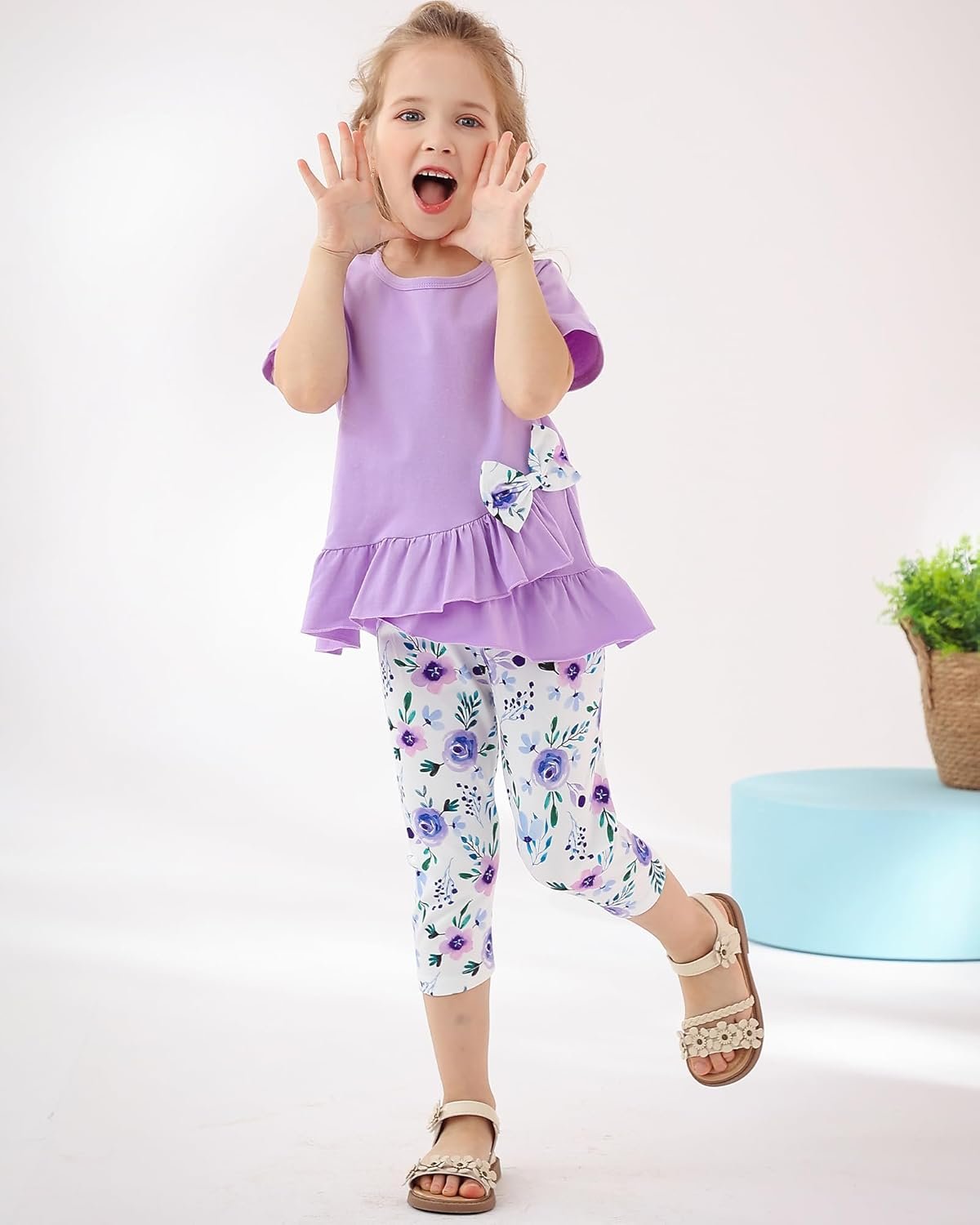 Toddler Girl Clothes 2-8Years Girls Outfit, Short Sleeve Ruffle Bowknot Top+Floral Capri Pants 2Pcs Spring Summer Set