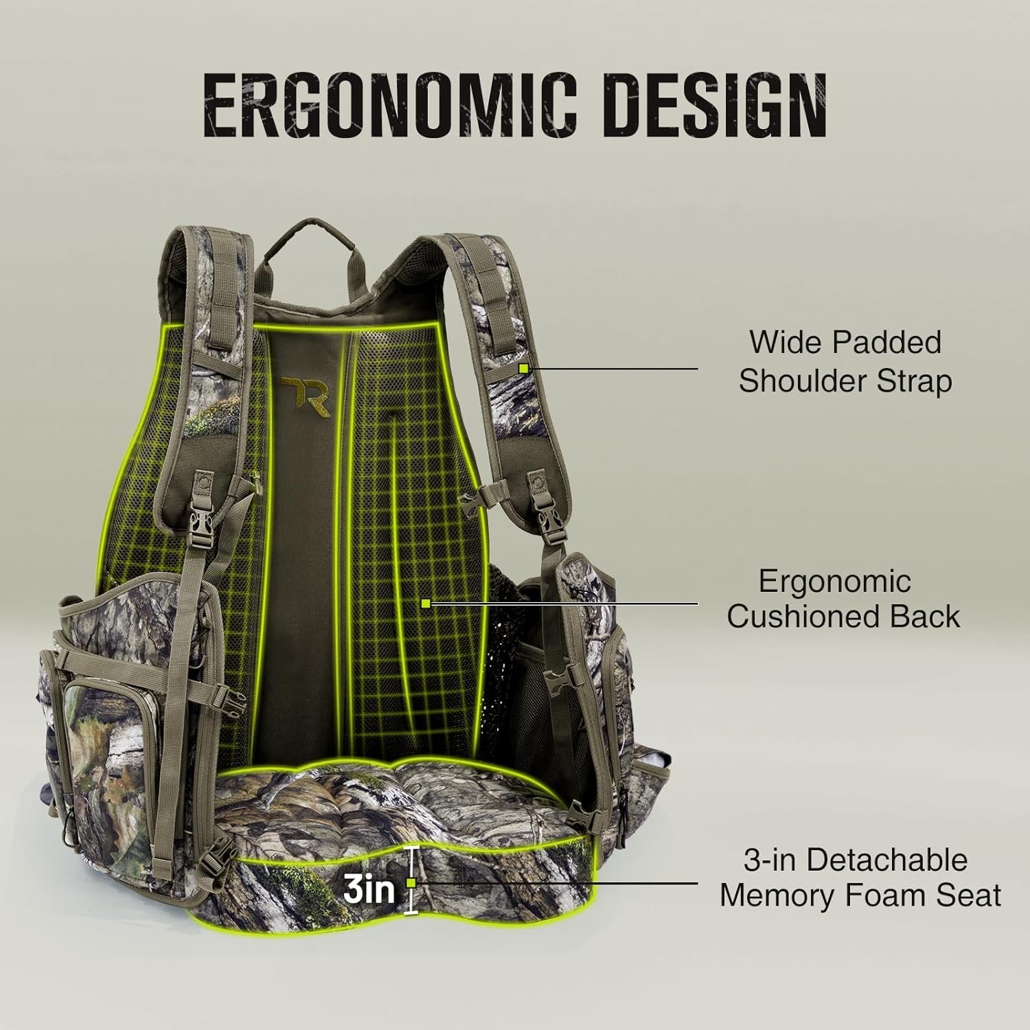 3” COMFORTABLE SEAT & ERGONOMIC CUSHIONED BACK: TR Turkey Hunting Vest is equipped with a 3 inch thick detachable, memory foam seat that allows you to sit comfortably anywhere in the woods or fields. Due to the built-in magnets, the cushion can be quickly folded up and tucked away for easy running and gunning. The ergonomic padded back and wide padded shoulder straps can greatly reduce the pressure on the back and shoulders, making hunting easier and more enjoyable.