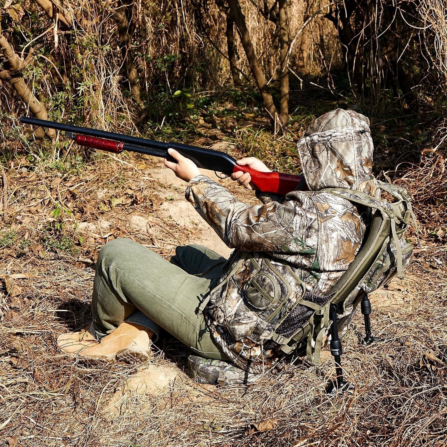 DURABLE MATERIAL : Reinforced stitching and the cushion bottom is made of wear-resistant and moisture-resistant rubber, which can be used on all types of ground for long term use. Safety flag is designed in the pockets for your safety. High quality noise reduction fabric specifically designed to help you stay as quiet as possible in the woods, and anti-slip clip facilitate you to carry your hunting rifle to prevent slipping.