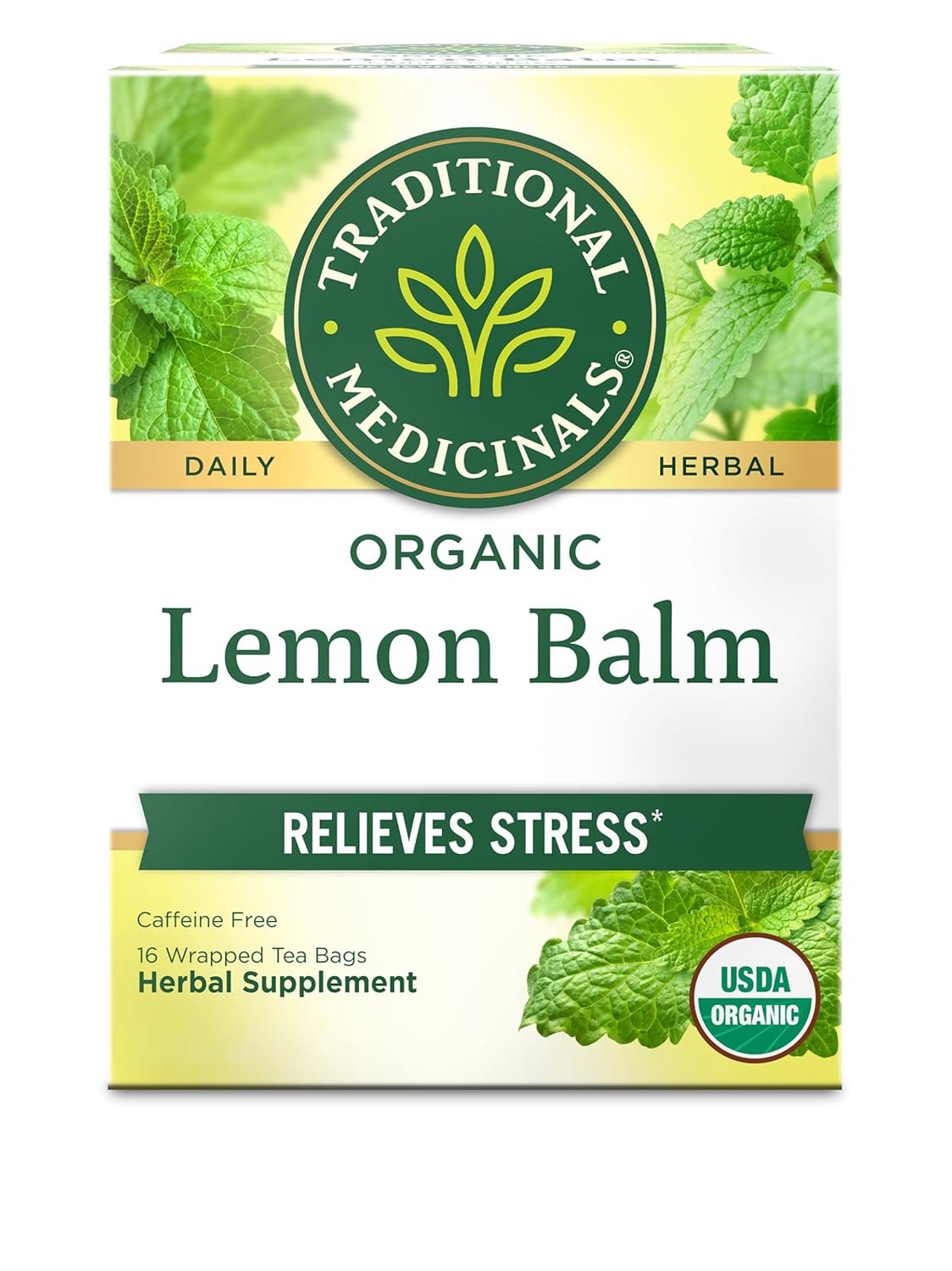 Traditional Medicinals Organic, Lemon Balm – Supports Stress Relief & Digestive Health – Kosher, Non-GMO, Caffeine-Free, Compostable – 16 Tea Bags
