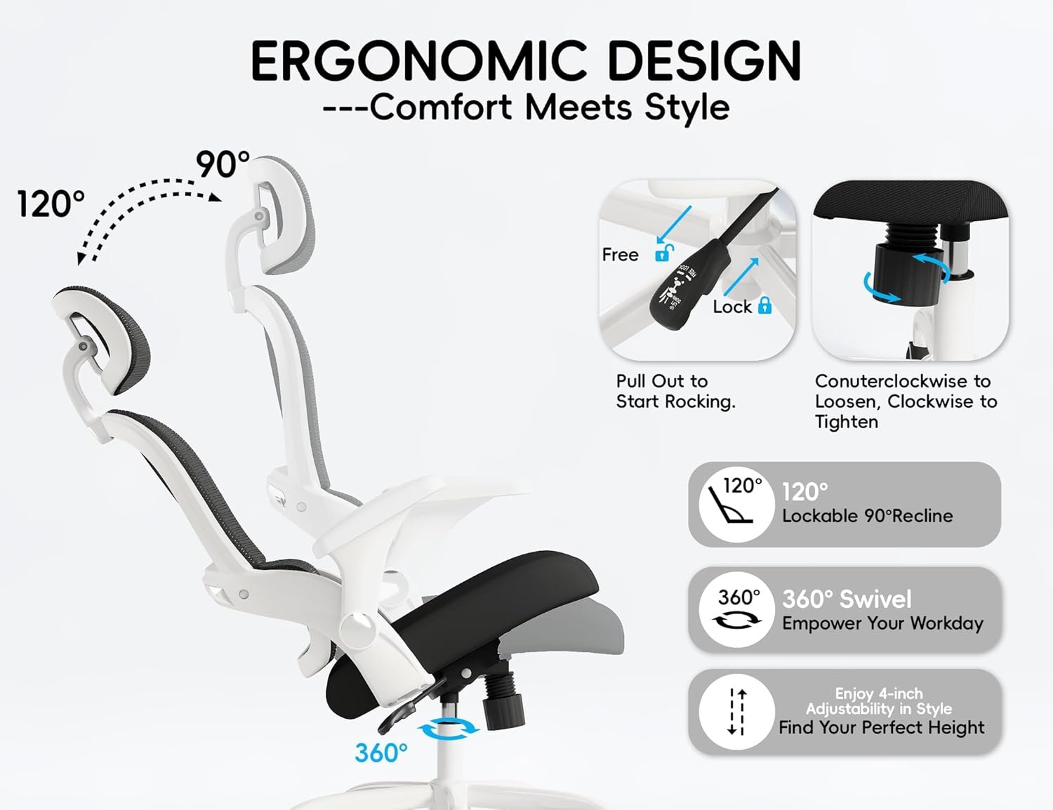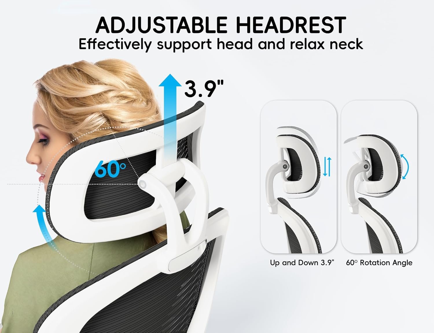 Adjustable 3D Headrest for Neck & Shoulder Relief:Customize your comfort with our 3D adjustable headrest, designed to cradle your neck and shoulders in the ideal position. Tilt, height, and angle adjustments ensure proper alignment, reducing strain from hours at your desk. Finally, a chair that cares for your posture as much as you do