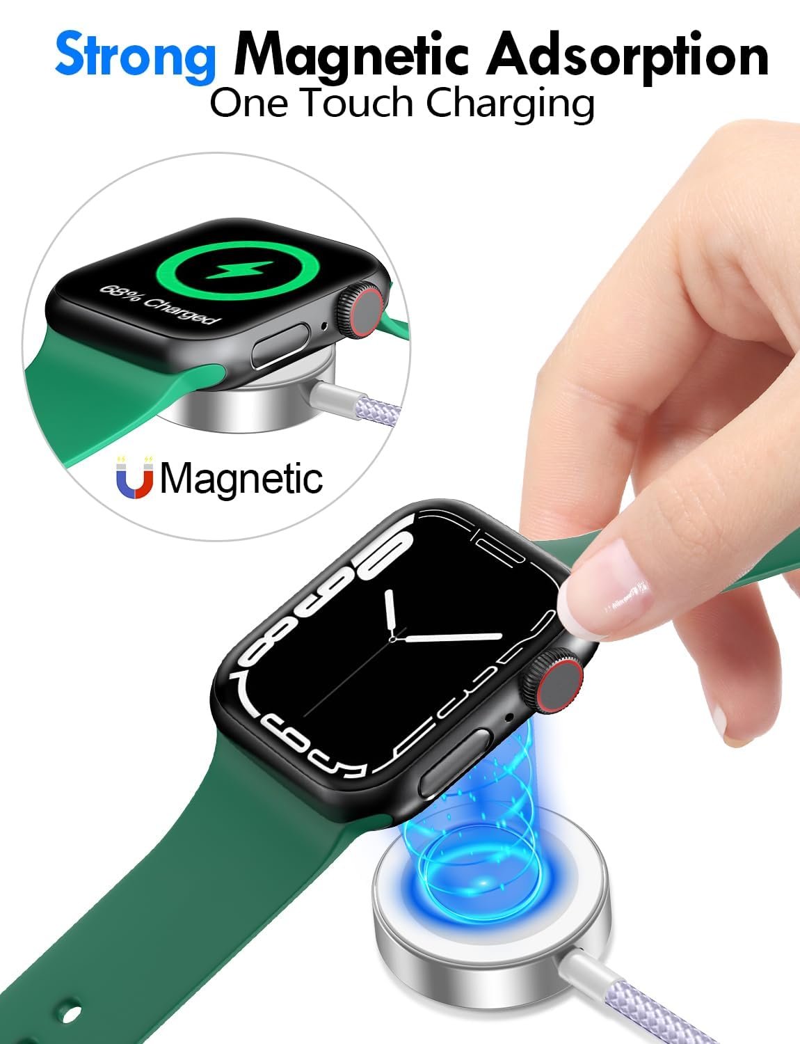 【Strong Magnetic Adsorption】The iWatch Charger with built-in magnet has strong adsorption perfectly snaps and centers to the charging coil on the back of your watch,stable and will not fall off,you will get wonderful charging experience(Note: no iwatch case for better charging speed).