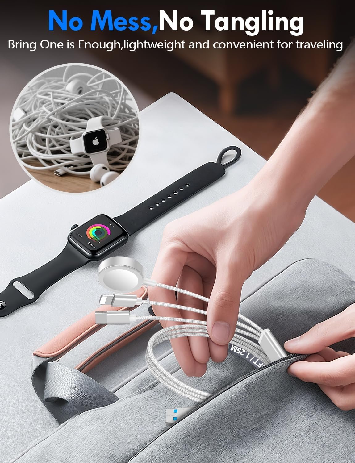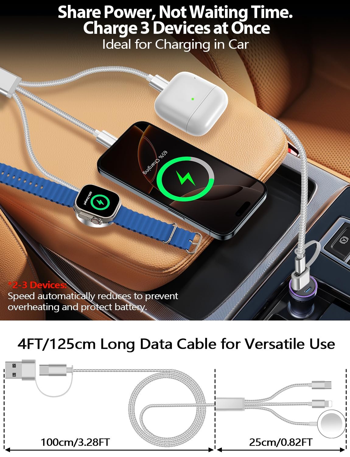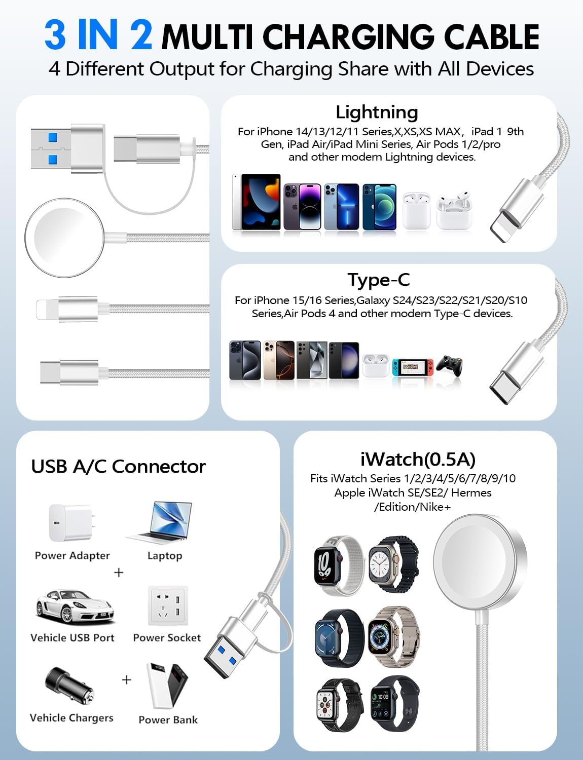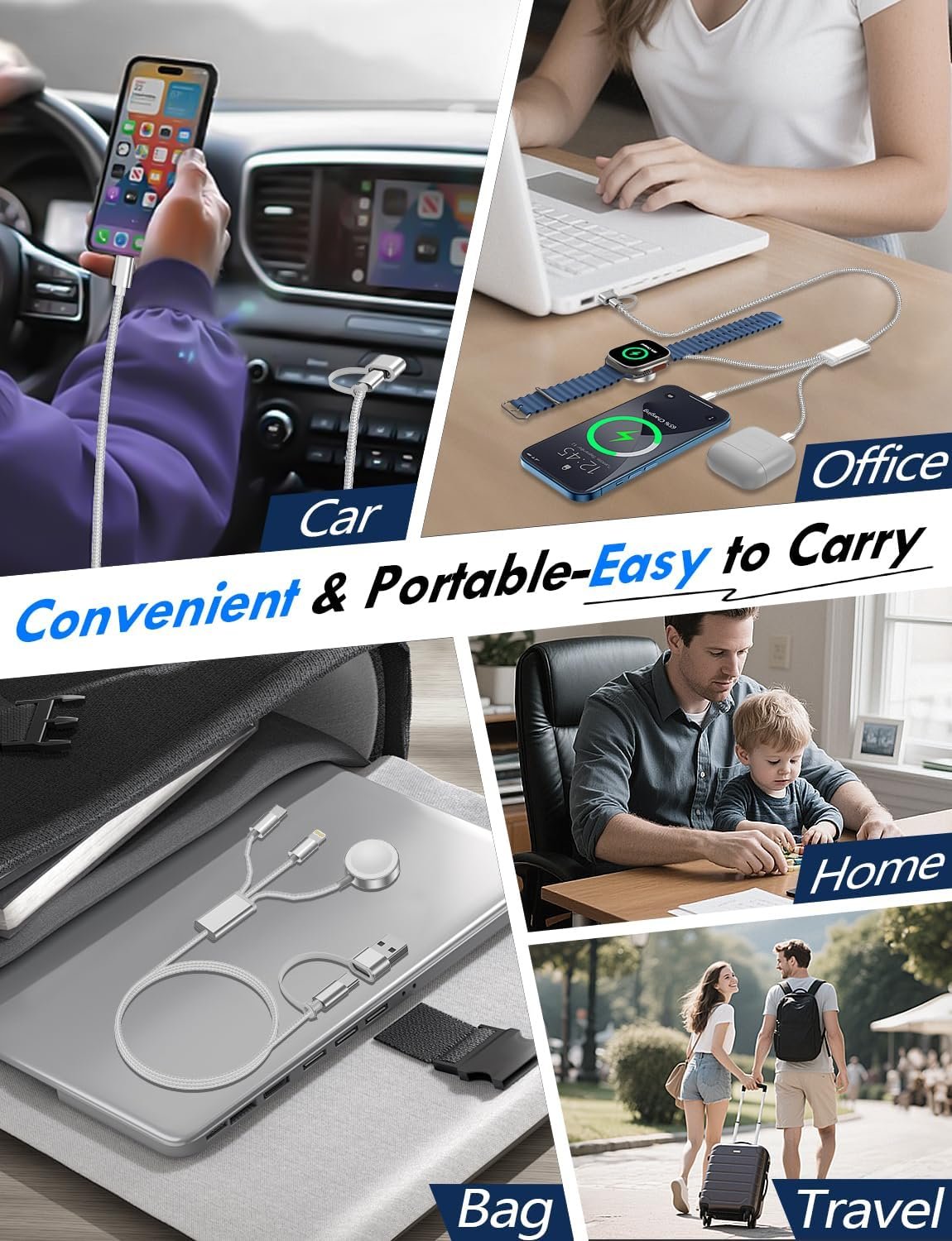【Portable Travel Camping Essentials&Car accessories】This 1.25M/4ft 3 in 2 charging cable docks is convenient to carry around with lightweight and portable design.It fits seamlessly into travel vocation essentials like bags and suitcases so it is a perfect choice when going on holiday,business trip,travel,office,dorm life,apartment living, college campuses,and hiking adventures. Ideal for charging in car,Charge iPhone, iWatch, and USB A to C cable-compatible devices simultaneously—no adapters needed.