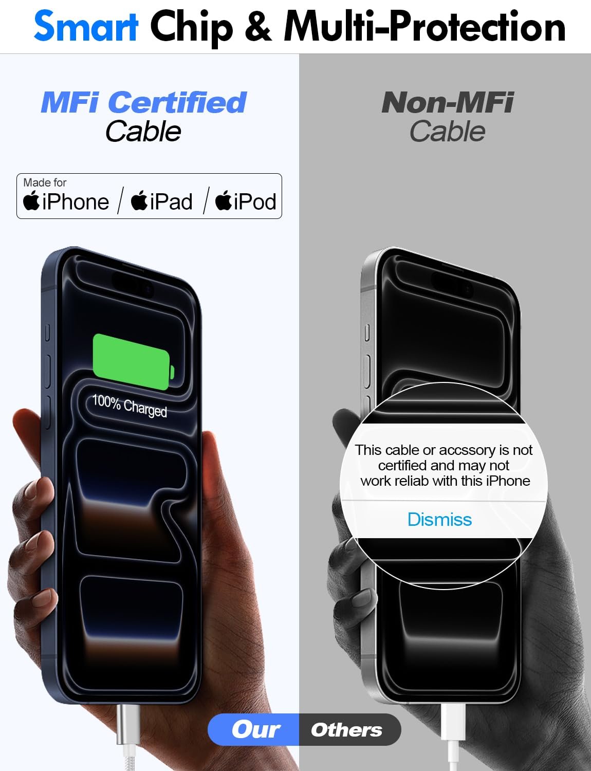 【Safe Smart Protection】Equipped with MFI-certified advanced safety mechanisms including over-current,over-voltage,short-circuit,and over-temperature protection. This charging cord for multiple devices features nylon braided shielding and sandblasted aluminum connectors to prevent fraying and overheating. Alos,this 3 in 2 Cable possesses excellent corrosion resistance,allowing it to be used safely and reliably in outdoor environments.