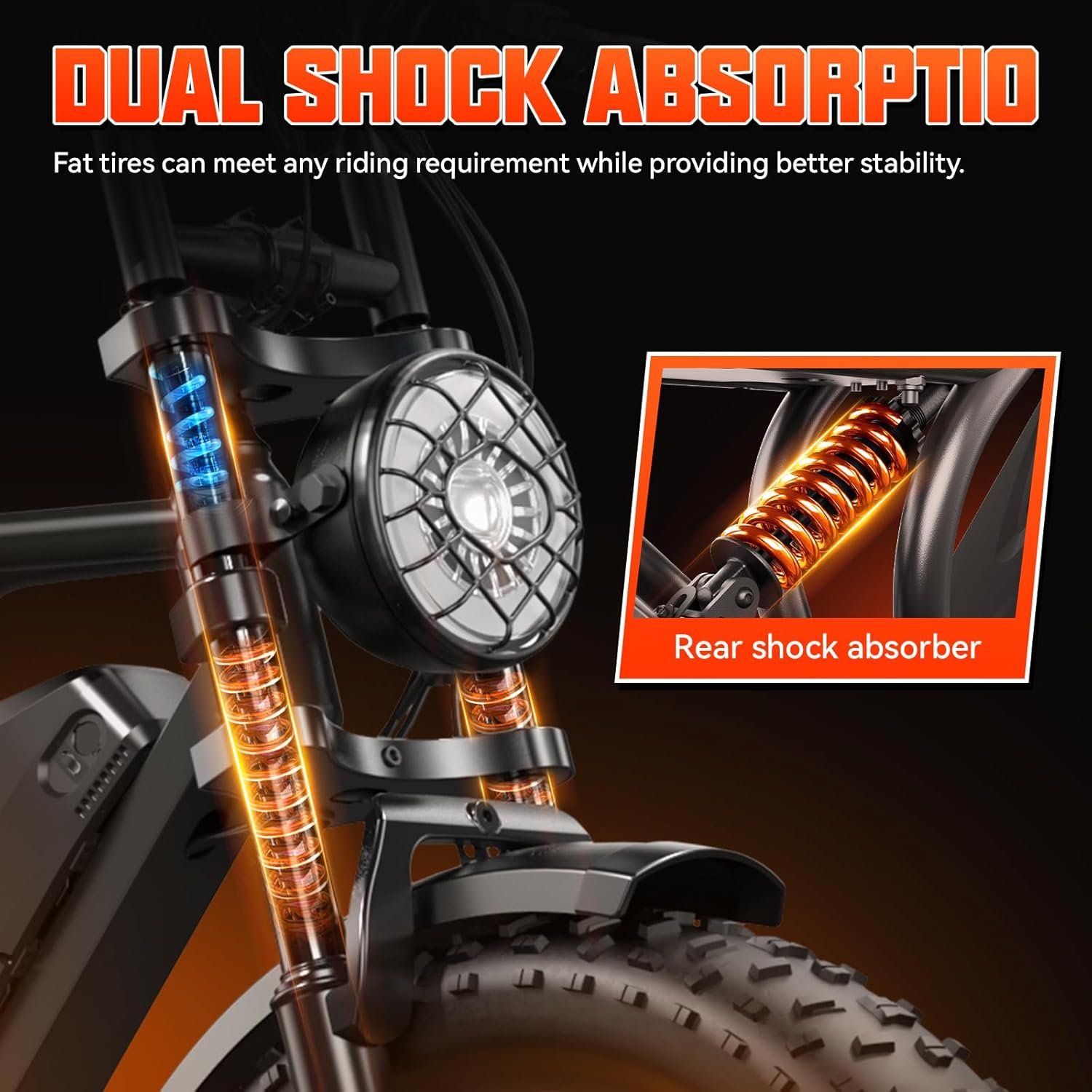𝗔𝗹𝗹-𝘁𝗲𝗿𝗿𝗮𝗶𝗻 𝗖𝘆𝗰𝗹𝗶𝗻𝗴 𝗦𝗮𝗳𝗲𝘁𝘆: This electric dirt bike is equipped with 20″x4.0″ puncture-proof wide tires and dual mechanical disc brakes. The enhanced traction and sensitive braking system ensure excellent handling and safety in all weather conditions. 360°LED lighting (headlight/brake light/turn signal) ensures clear visibility at night. The full suspension system absorbs bumps and can easily handle various road surfaces from city streets to rugged trails