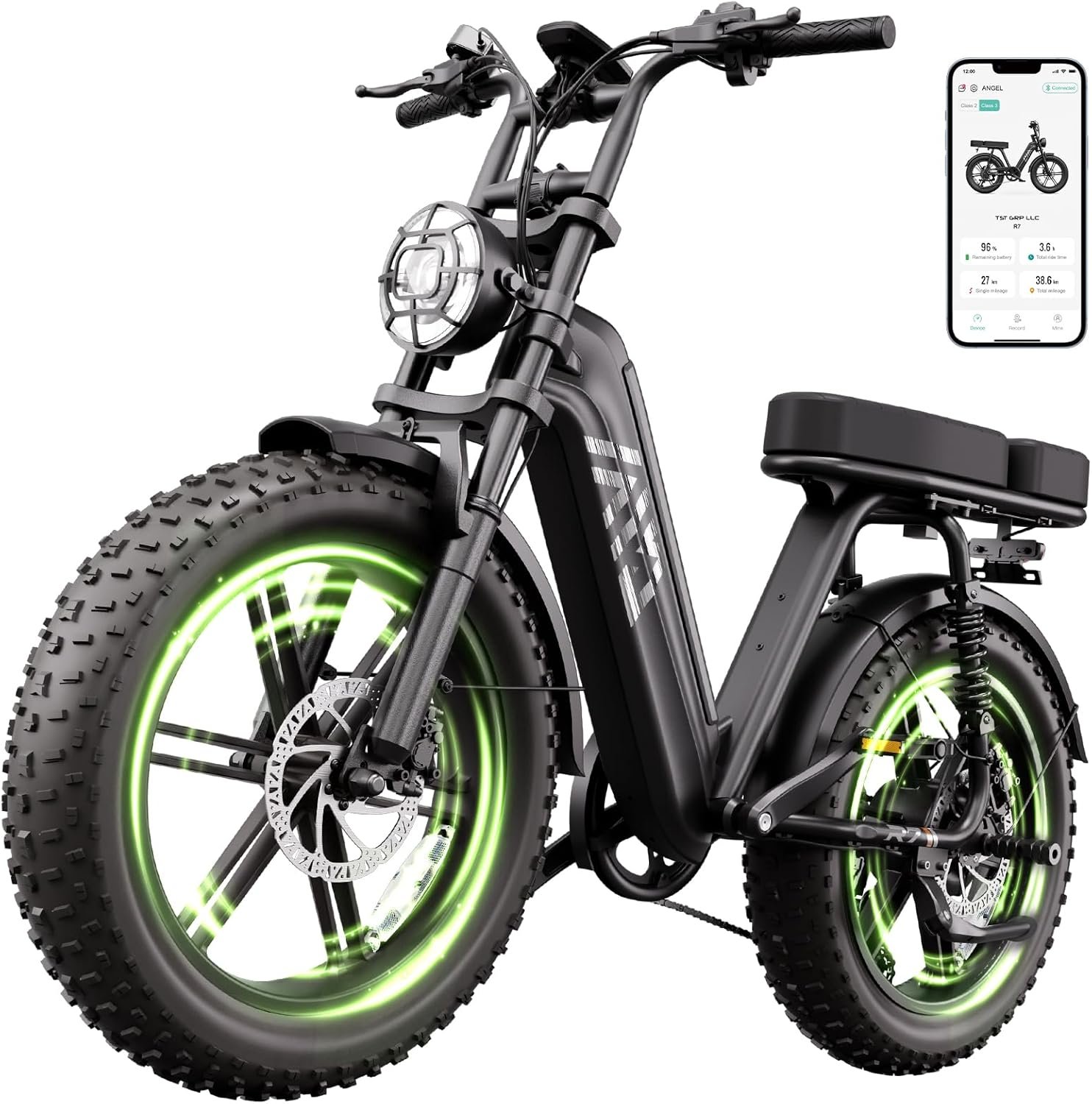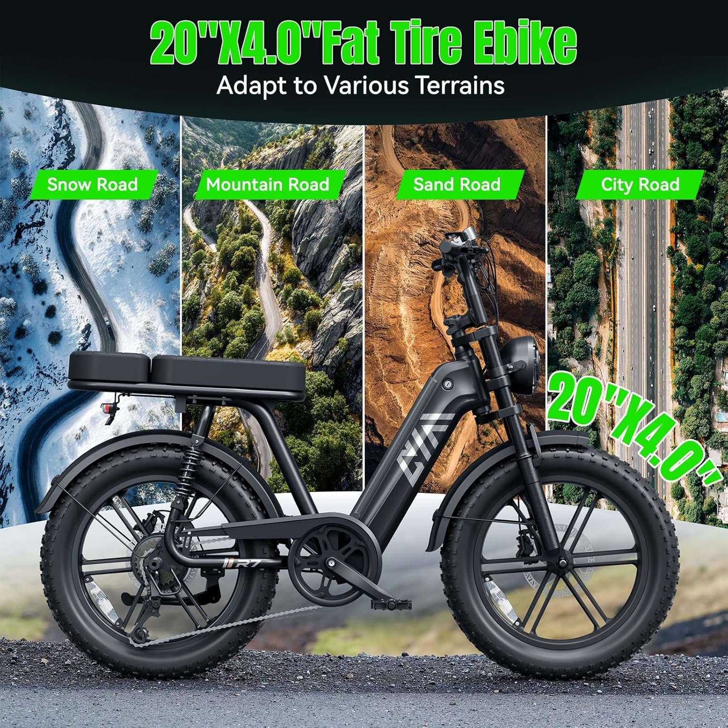 𝗔𝗹𝗹-𝘁𝗲𝗿𝗿𝗮𝗶𝗻 𝗖𝘆𝗰𝗹𝗶𝗻𝗴 𝗦𝗮𝗳𝗲𝘁𝘆: This electric dirt bike is equipped with 20″x4.0″ puncture-proof wide tires and dual mechanical disc brakes. The enhanced traction and sensitive braking system ensure excellent handling and safety in all weather conditions. 360°LED lighting (headlight/brake light/turn signal) ensures clear visibility at night. The full suspension system absorbs bumps and can easily handle various road surfaces from city streets to rugged trails