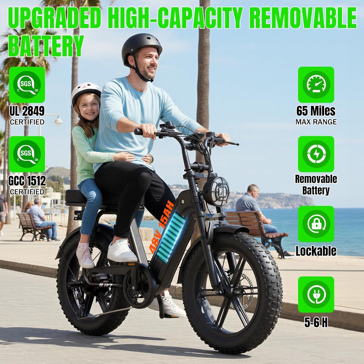 𝗦𝗺𝗮𝗿𝘁 𝗕𝗮𝘁𝘁𝗲𝗿𝘆 𝗦𝘆𝘀𝘁𝗲𝗺: This adult electric bikes is equipped with a waterproof 48V/15AH removable battery with two charging methods and energy-saving technology, which can travel more than 60 miles per charge. It can be fully charged in 5 hours, making it ideal for commuting or off-grid adventures Safety tested to UL 2849