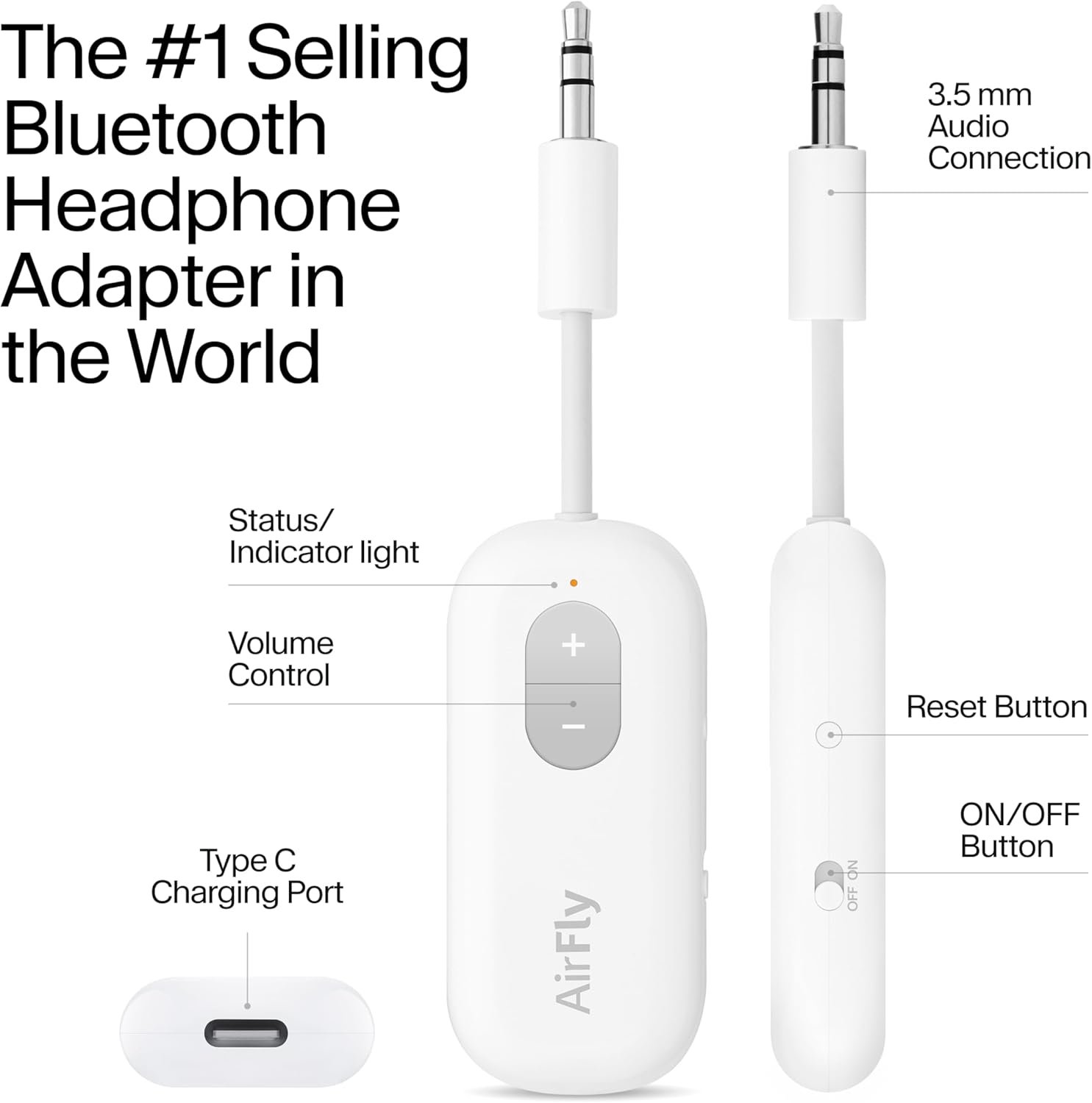 Extended Battery Life – Enjoy uninterrupted audio for over 20 hours on a single charge, perfect for long-haul flights. Plus, the AirFly can be used while charging with the included USB-C cable, ensuring you never run out of battery life.
