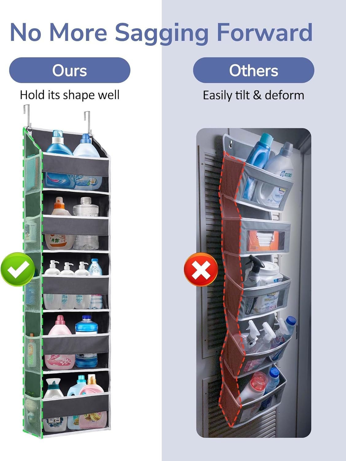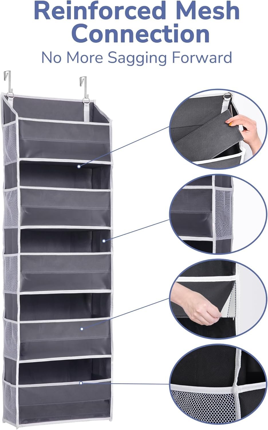 Stable & Well-Structured – Designed with stitched sides and reinforced cardboard on the front, sides, and bottom, this door organizer hanging maintains its shape and is less likely to deform or tilt when fully loaded.