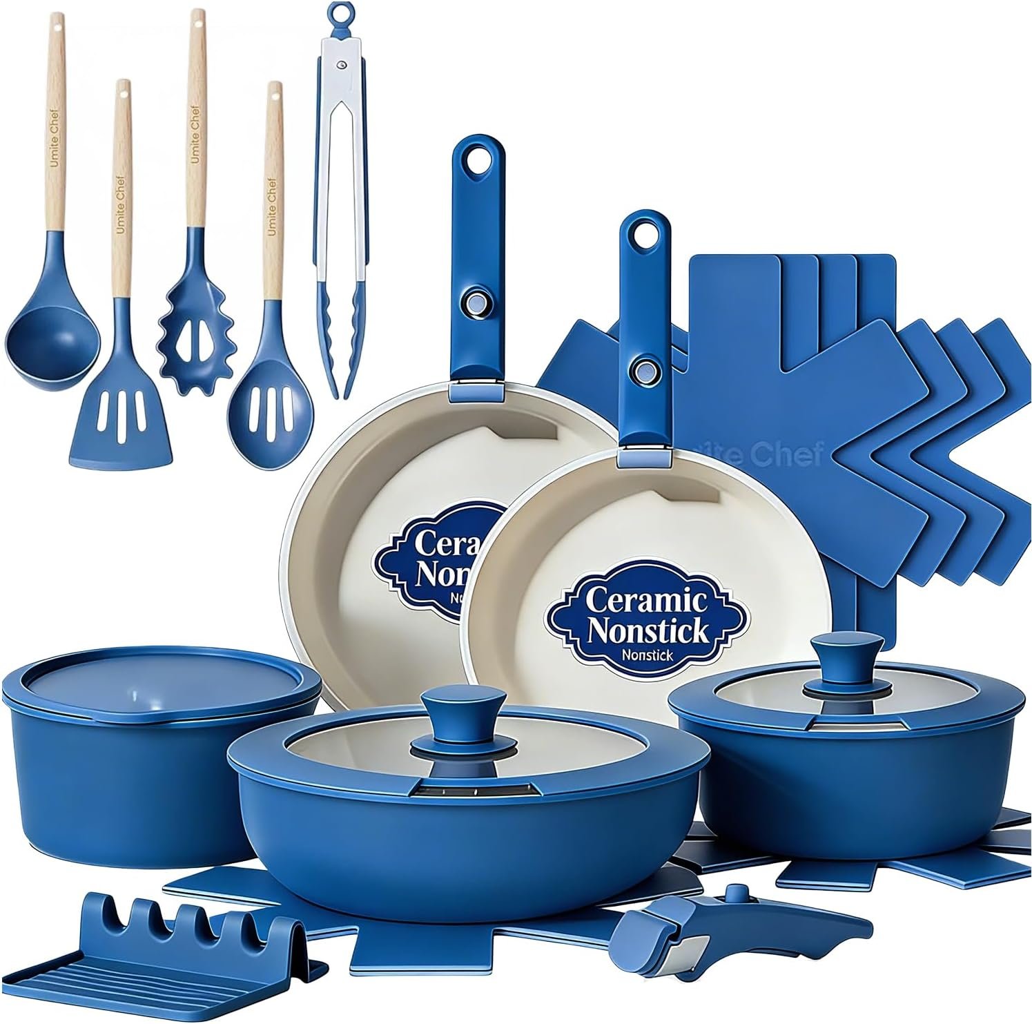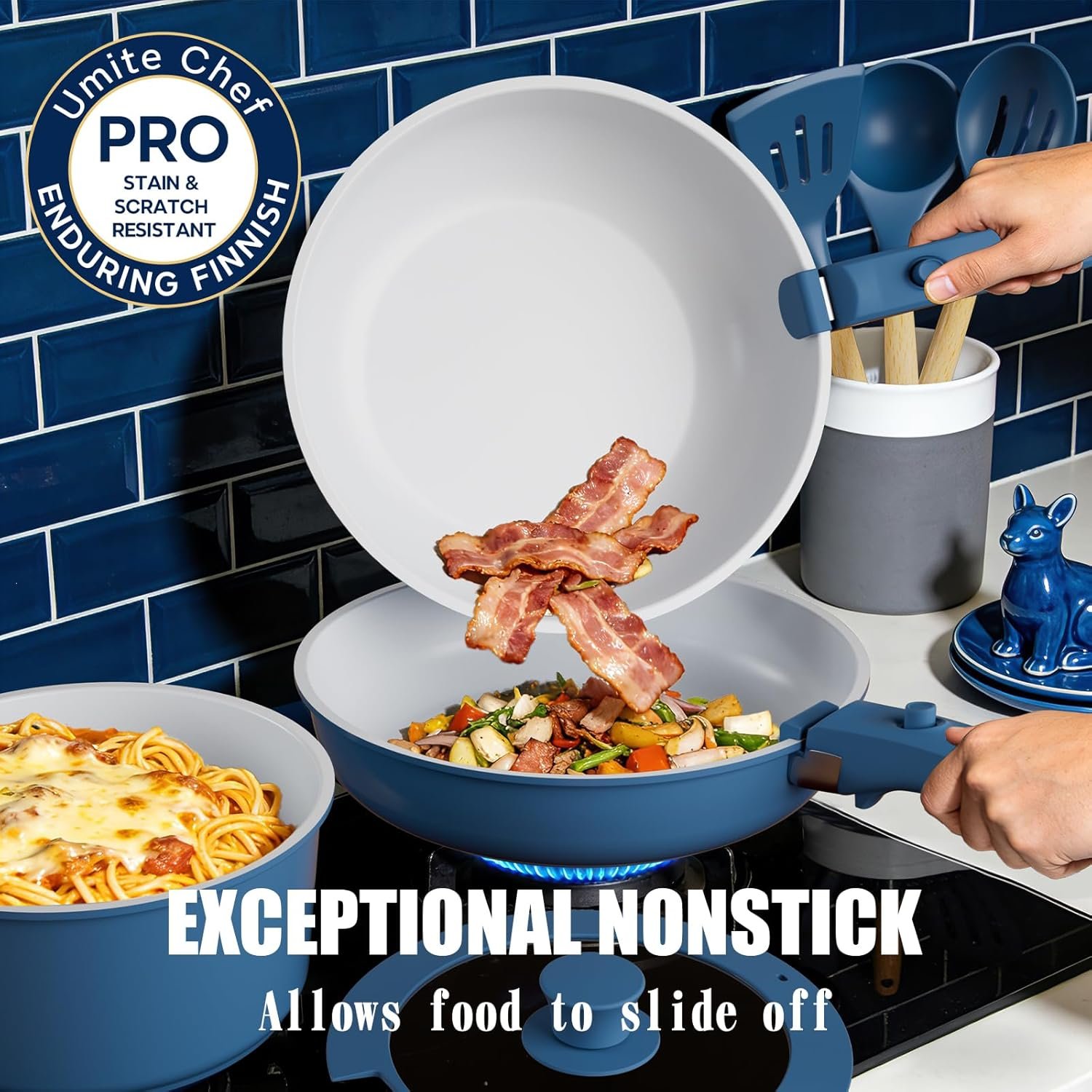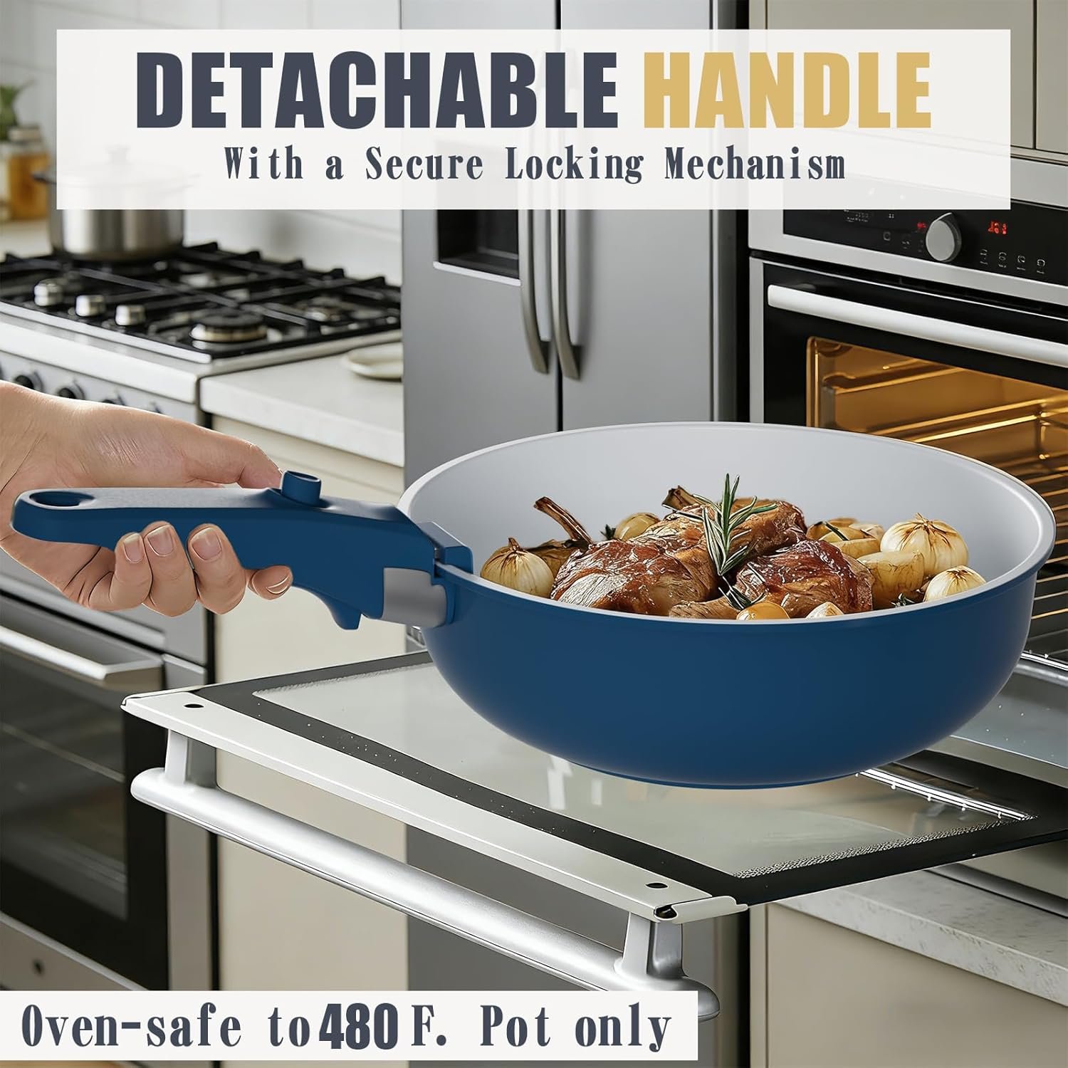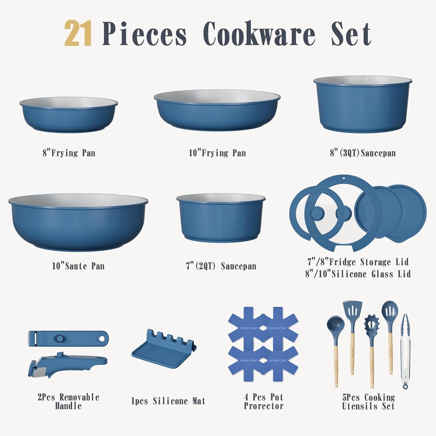 Umite Chef Pots and Pans Set Non Stick, 21 pcs Ceramic Cookware Set with Detachable Handles, Healthy Induction Cookware Oven Safe RV Kitchen Cooking Set with Utensils, PFAS PFOA & PTFE Free, Navy