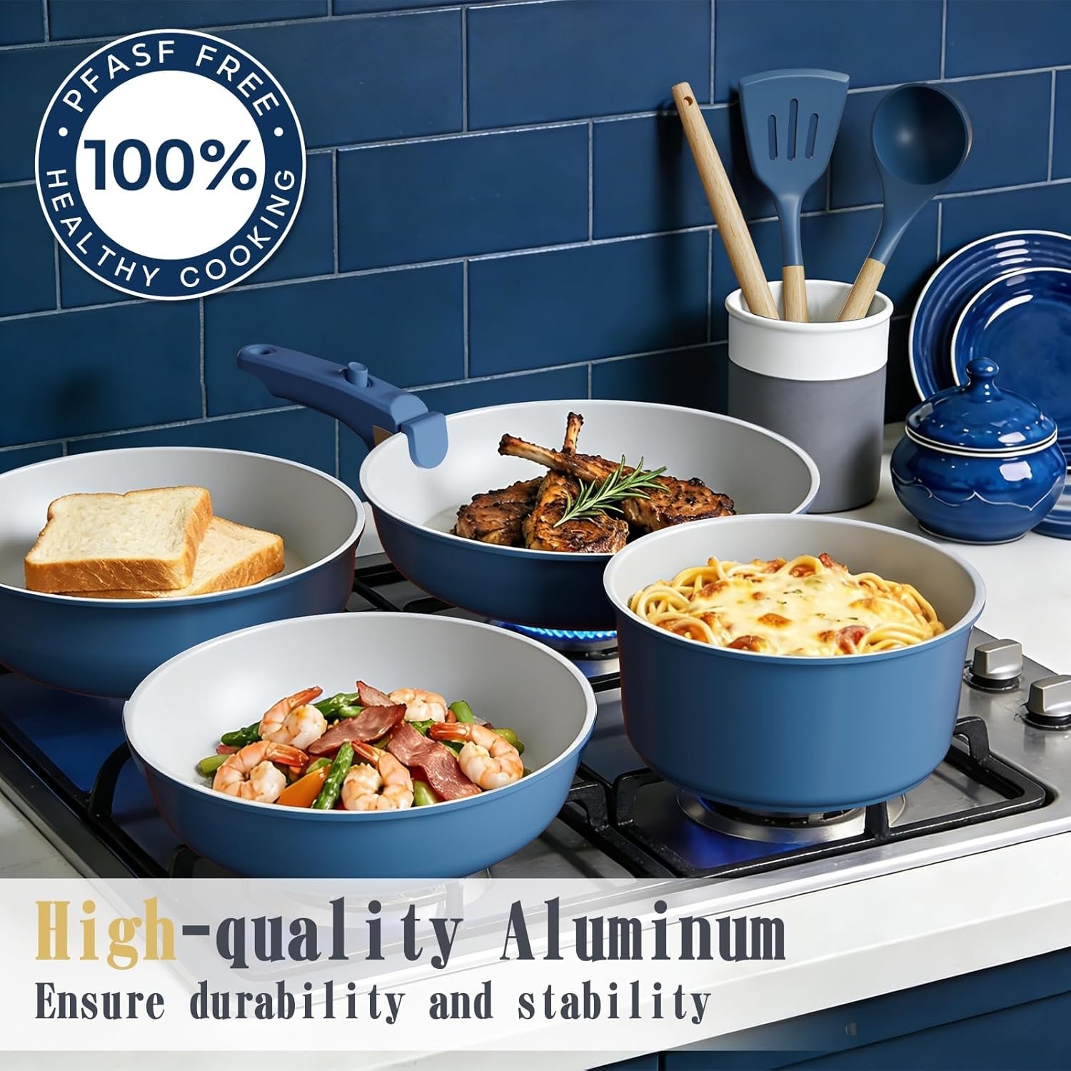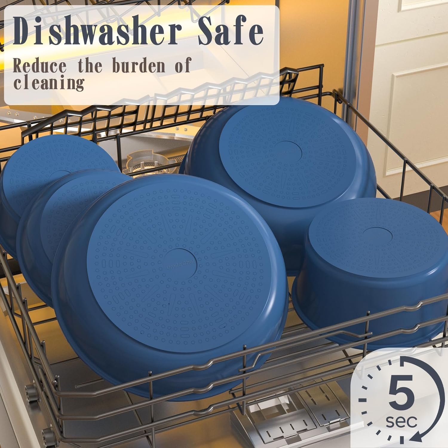 【Healthy Non-Stick You Can Trust—PFOA-Free & PTFE-Free】This healthy nonstick cookware set features an advanced mineral-reinforced granite coating that is 100% PFOA-free, PTFE-free, and PFOS-free—so you’ll never have to worry about toxic fumes or harmful chemicals leaching into your food. The ultra-durable, multi-layer surface is chemically bonded to the aluminum core, creating a shield that resists chipping, peeling, and scratches. Cook with little to no oil for lighter, healthier meals with these non-toxic cookware