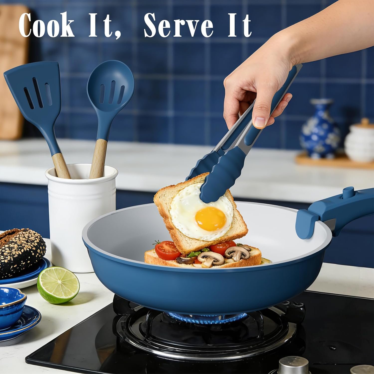 【Complete 21-Piece Kitchen Solution—Everything You Need】Why buy pieces separately? This all-in-one 21 piece cookware set has everything to start cooking: 8″ & 10″ frying pans, 10″ saute pan, 7″ & 8″ saucepans with both tempered glass lids (with silicone rim) for easy monitoring and airtight storage lids for leftovers. This cookware set with lids includes 5 pcs silicone kitchen utensils, a silicone mat, and pot protectors. Whether you need a frying pan set, saucepan set, or complete kitchen cookware set, this nonstick cookware set delivers