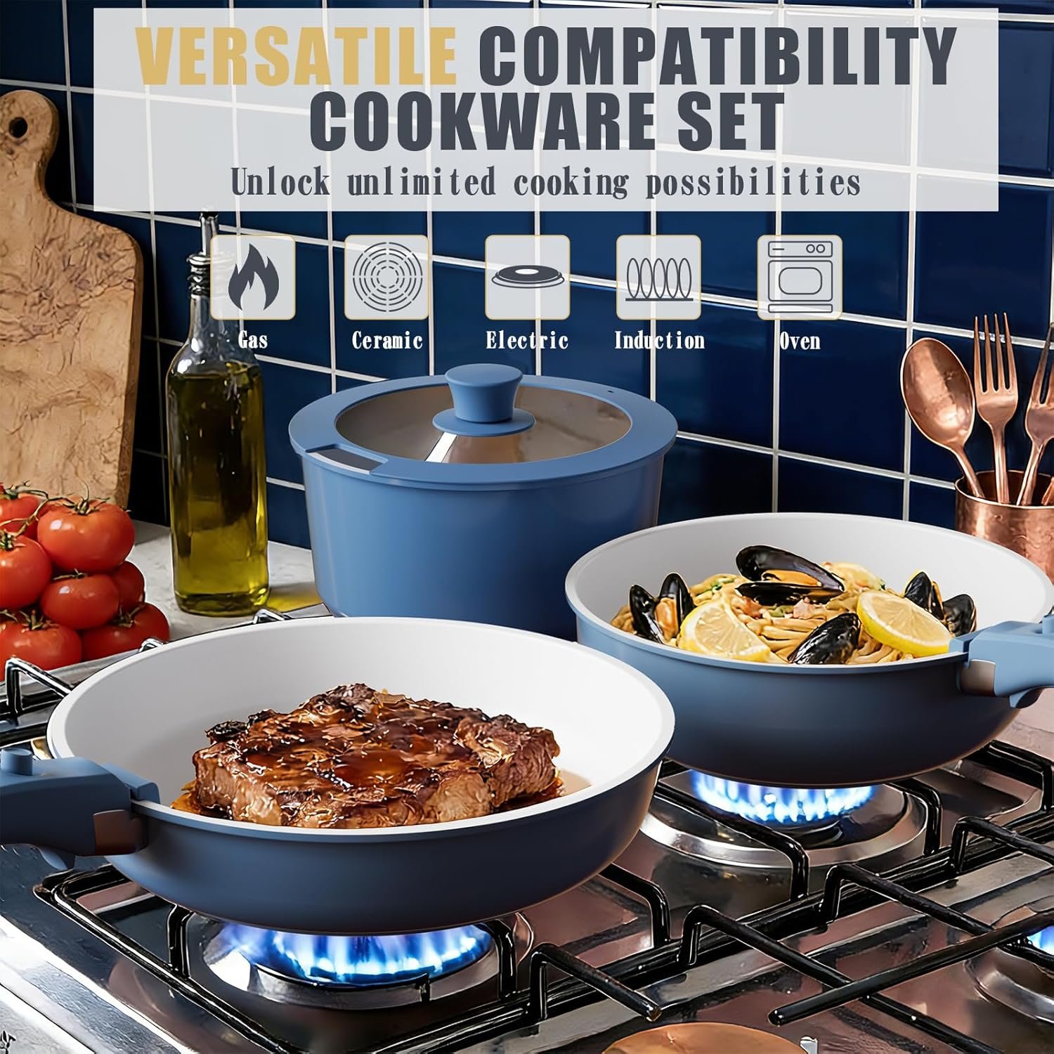 【Professional Die-Cast Aluminum Construction—Even Heat Distribution】Our heavy-duty die cast aluminum cookware ensures rapid and even heat distribution with no hot spots. This professional cookware heats up quickly and consistently—whether you’re searing a steak or simmering a delicate sauce. Meals cook 50% faster with these aluminum nonstick cookware, delivering restaurant-quality results at home. The heavy duty cookware construction means no more burnt edges or undercooked centers—just perfect cooking every time