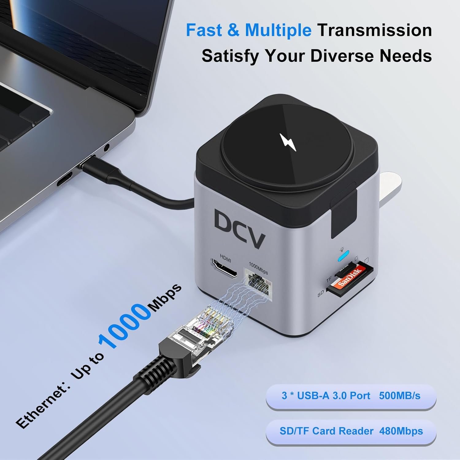 Stable 1Gbps Ethernet: DCV USB C ethernet adapter provides faster data transfers and better security than most Wi-Fi connections; Plug the usb c hub into your laptop and plug in an ethernet cable, supporting up to 1000Mbps for lag-free internet browsing, and downloads. DCV usb docking station is the Ideal solution for unstable Wi-Fi or a failed network card.