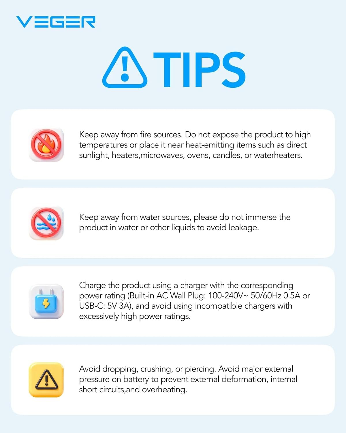 Charge the product using a charger with the corresponding power rating (Built-in AC Wall Plug: 100-240V~ 50/60Hz 0.5A or USB-C: 5V-3A), and avoid using incompatible chargers with excessively high power ratings.