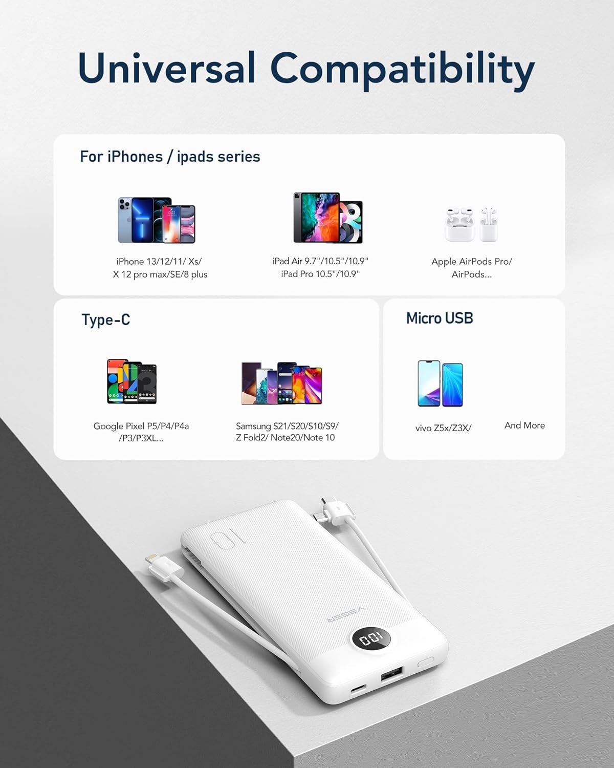 Universal Compatibility: Works seamlessly with almost everything you own. From the latest iPhone 17 and iPad to Samsung Galaxy phones, Google Pixel, tablets, Bluetooth headphones, and even smartwatches via the low-current Micro USB cable. Simply use the built-in cable or your own—it’s designed to be your one-stop power solution for every device in your life.
