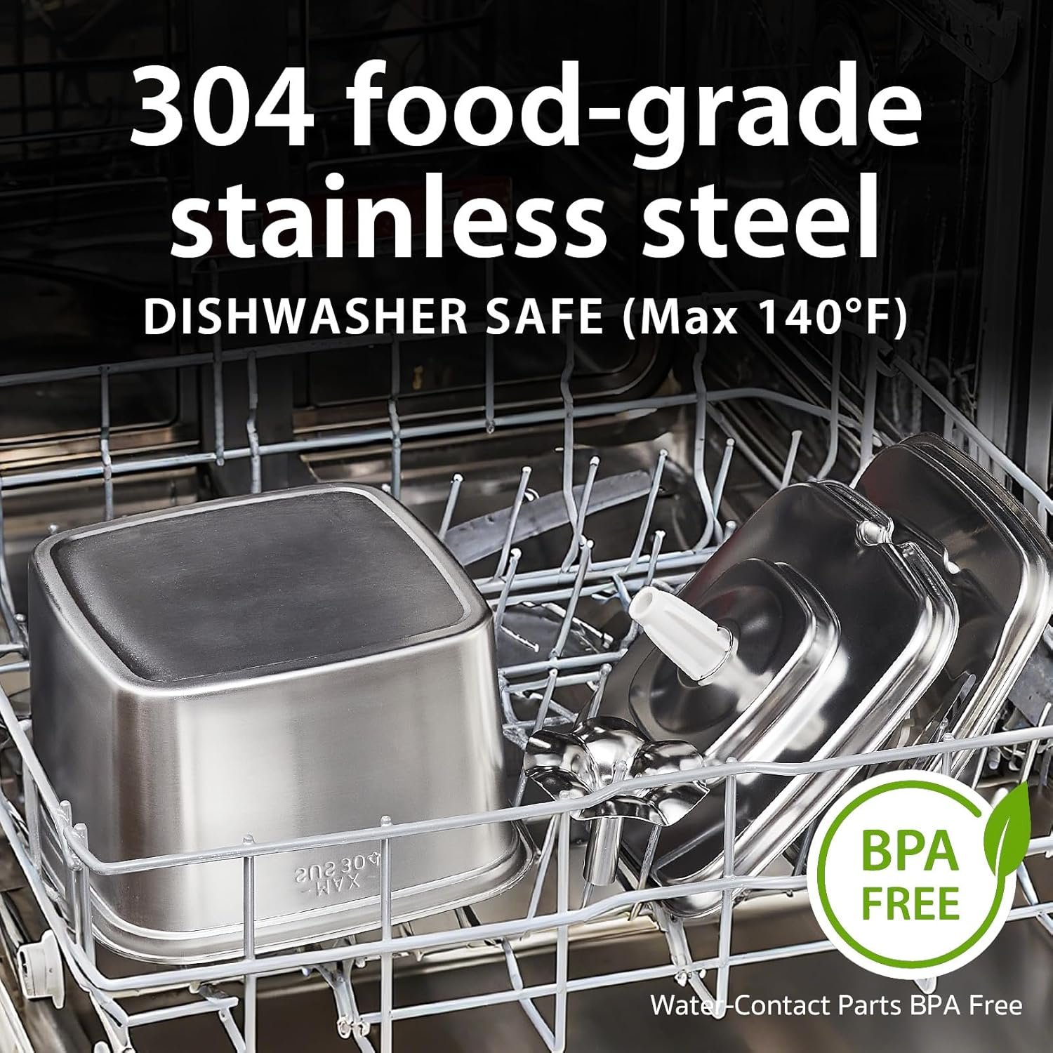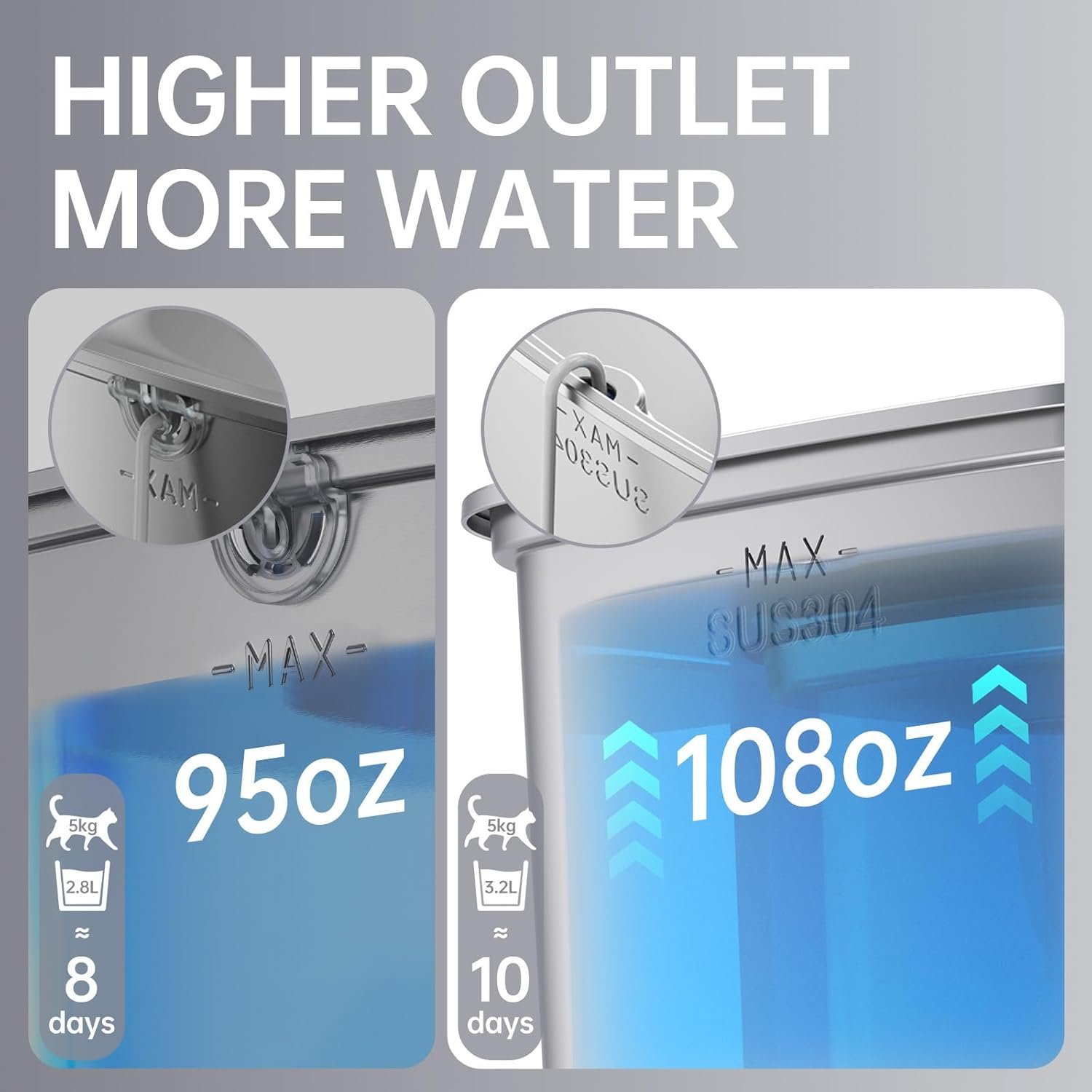 Premium 304 Stainless Steel & Easy Maintenance. Crafted from high-quality 304 stainless steel, this pet fountain offers a durable, premium build. It’s easy to clean — all water-contact parts are top-rack dishwasher safe and completely BPA-free. With a generous 108 oz (3.2 L) capacity, it provides plenty of fresh water while reducing the need for frequent refills.
